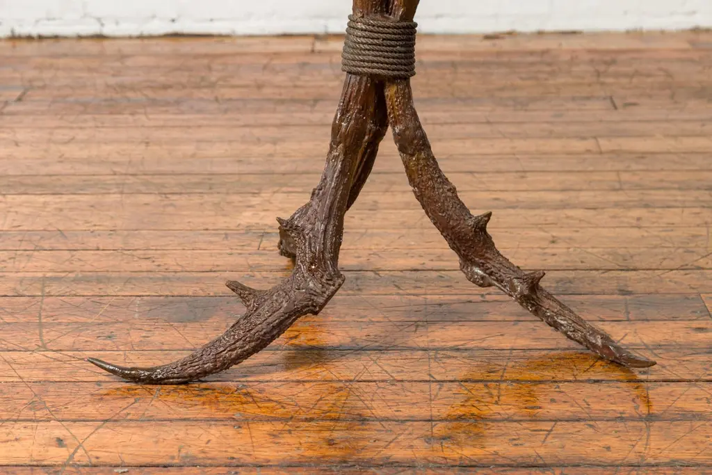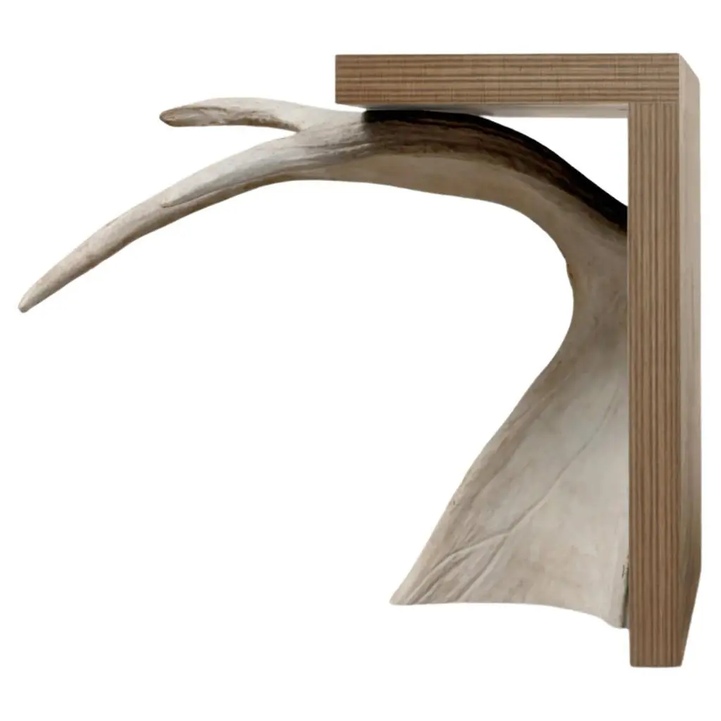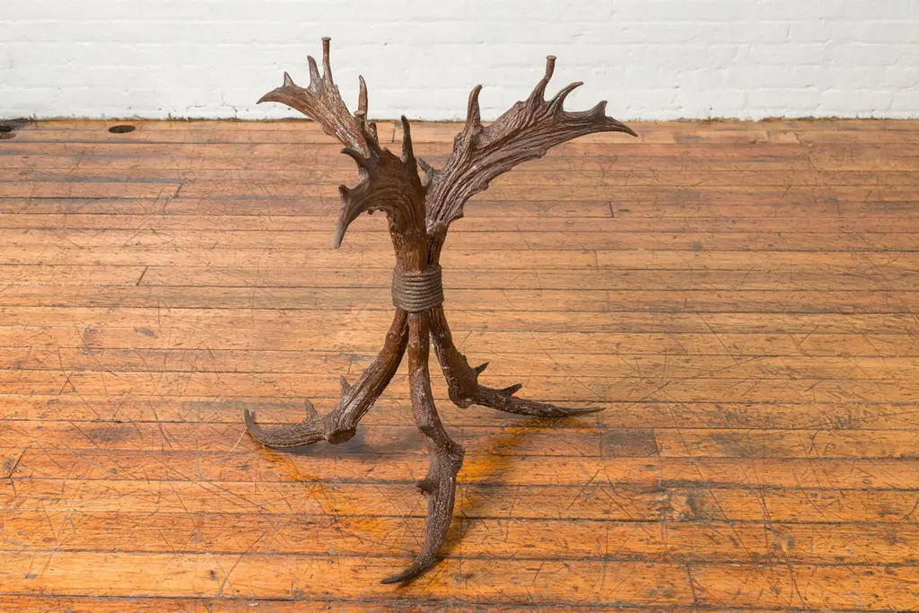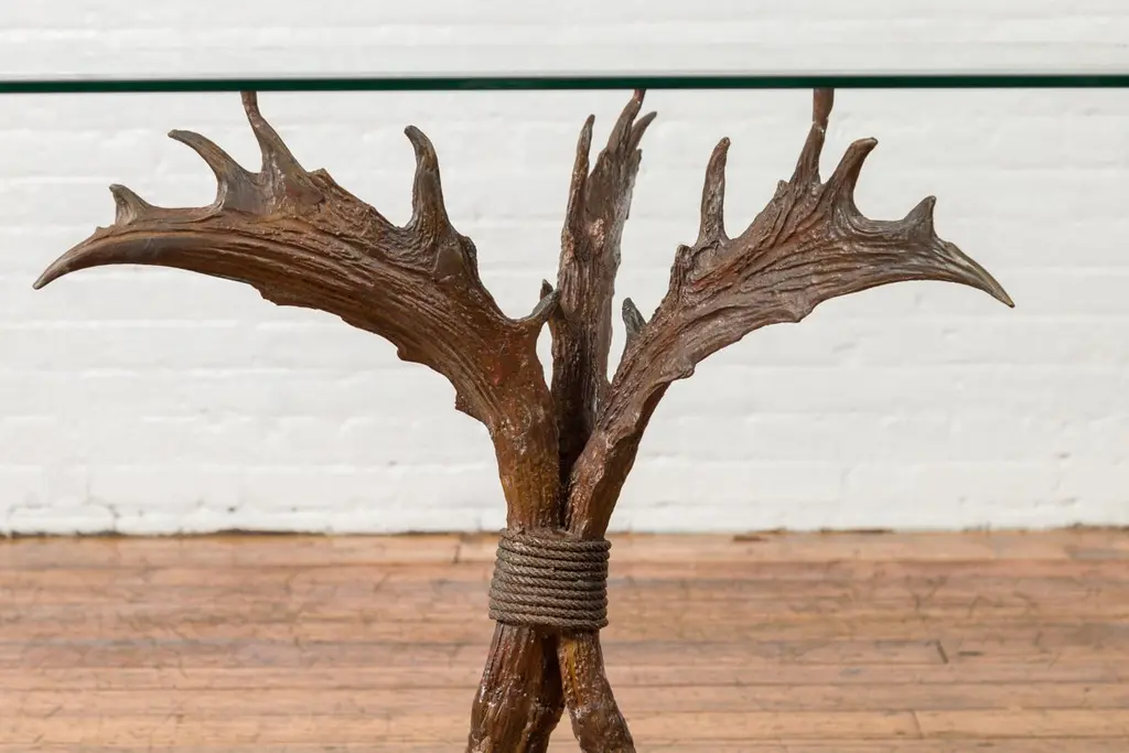 This vintage lost-wax bronze table is crafted to resemble a dramatic bundle of antlers, its sculptural form bound at the center with a cast rope detail. The finely textured surface showcases the time-honored lost-wax casting process, capturing the rugged natural grain and lifelike detail of the antler motif with striking realism.With its organic yet architectural presence, the table offers remarkable versatility, blending easily into rustic, lodge, country house, or even modern interiors where a bold natural element is desired. The bronze base provides both durability and artistry, designed to support a transparent glass top of your choice—whether square or round—allowing the sculptural base to remain the focal point.Ideal as a center table, side table, or accent piece, this design brings a sense of the outdoors inside, marrying craftsmanship with timeless style.Please note: glass top is not included with the bronze base.