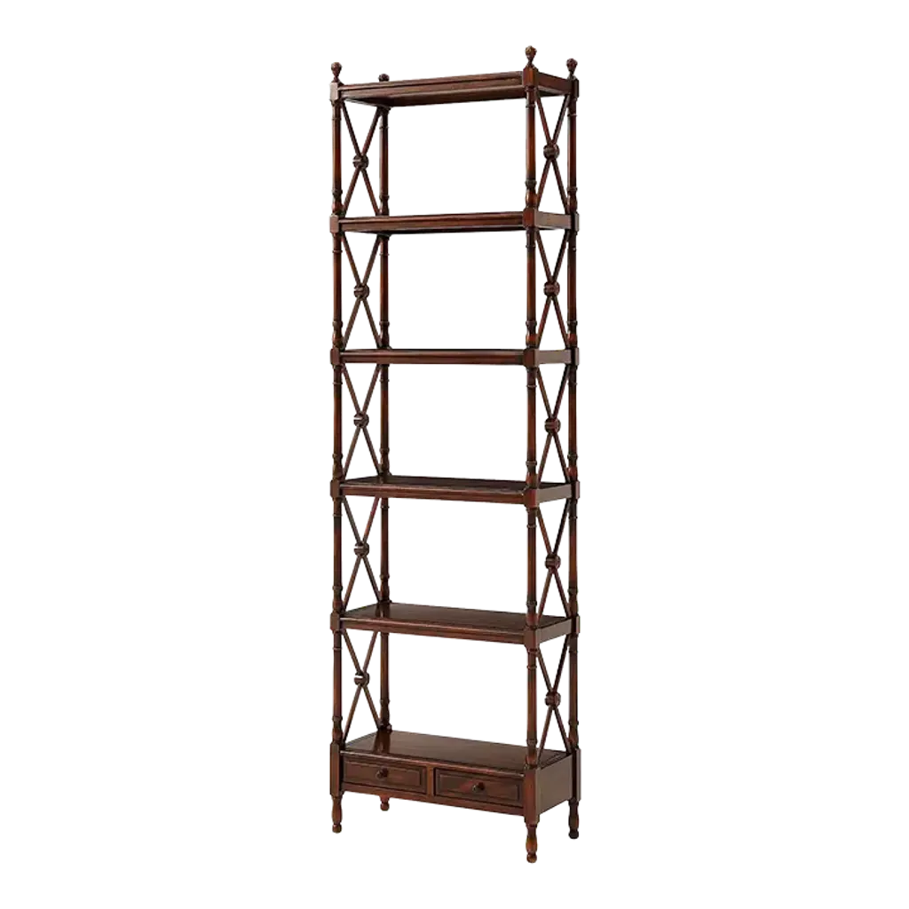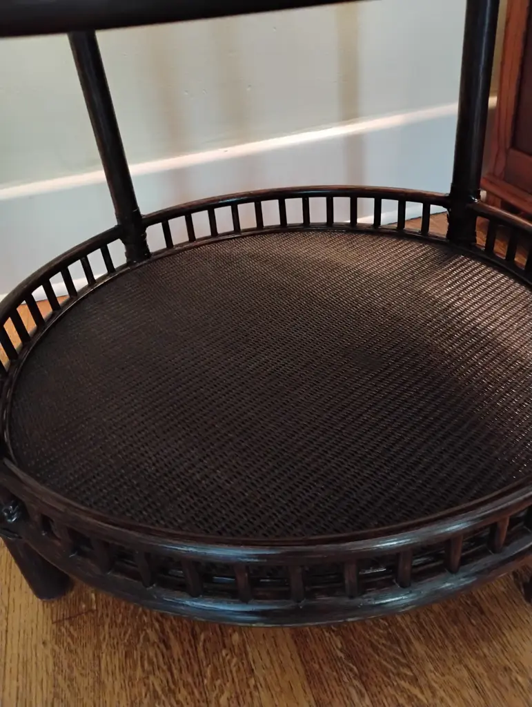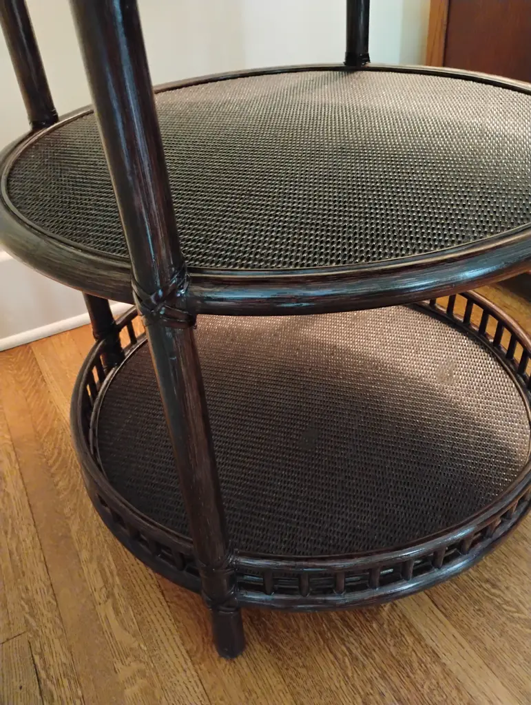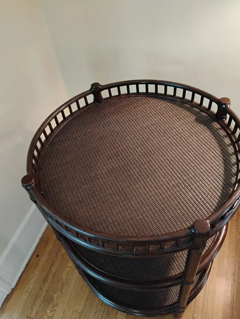 McGuire 3 tier side table or bar cart. Rattan with x- wrapped leather binding in espresso brown. Stands 30.5" high Diameter 25.5" Clearance on bottom shelf 13" Clearance on middle shelf 9" Fabulous for storage or side tables. Two tables available.