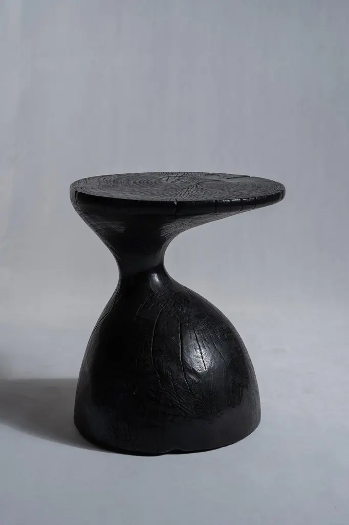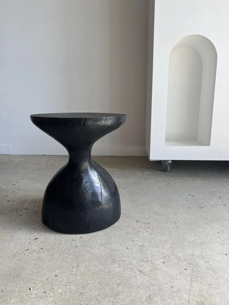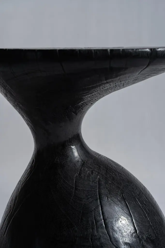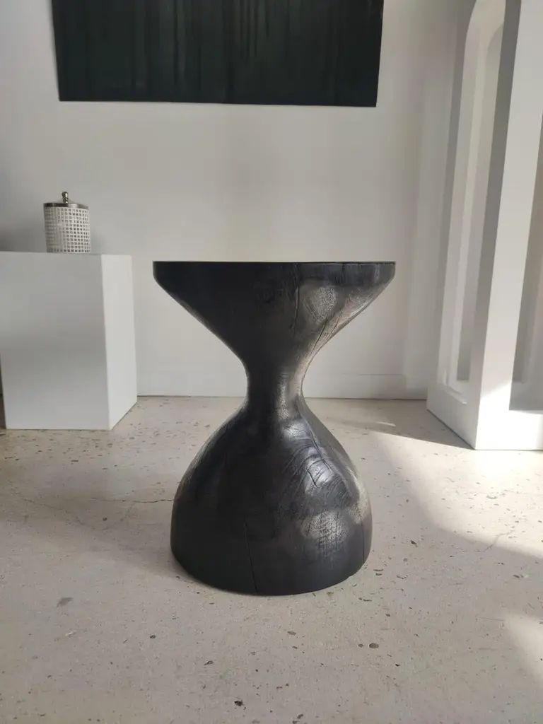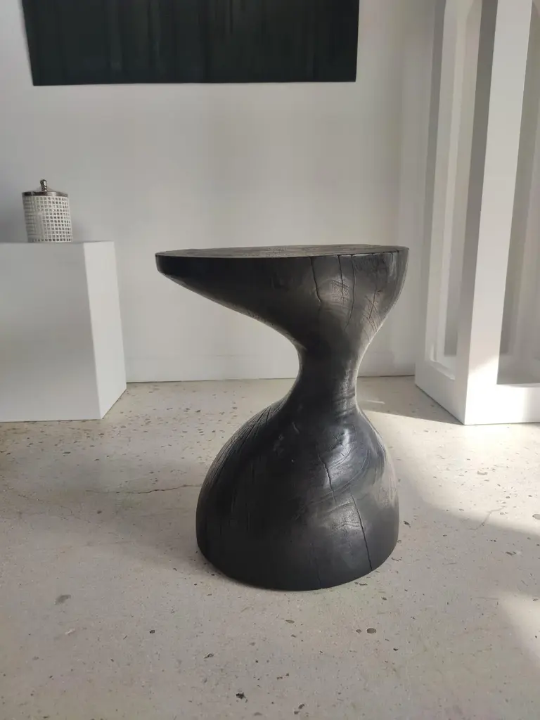 Sexy Neck - End table in solid wood (mango wood) monoxyl organic shape black color. Ideal furniture as a side table, end table for the living room (lamp, speaker, books, decorative objects), can be used as a stool or bedside table. The natural roughness of the wood (irregularities, rings and cracks) gives all the charm and singularity of this unique piece. Height: 45cm; diameter of the top or seat: 39cm.