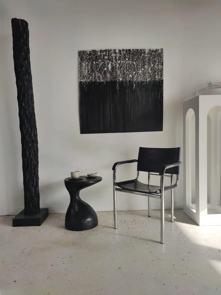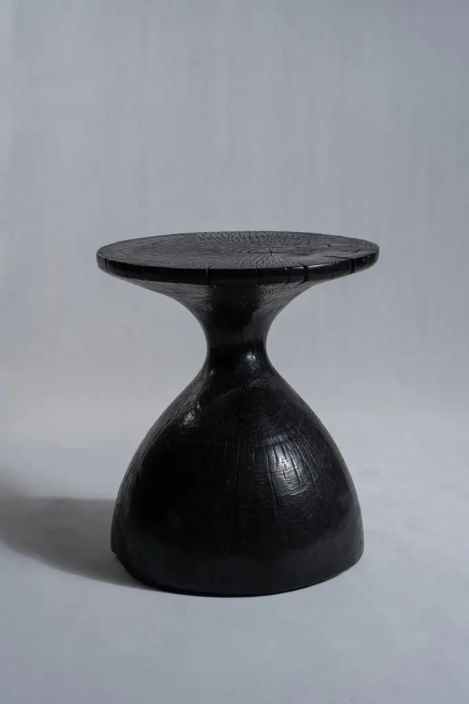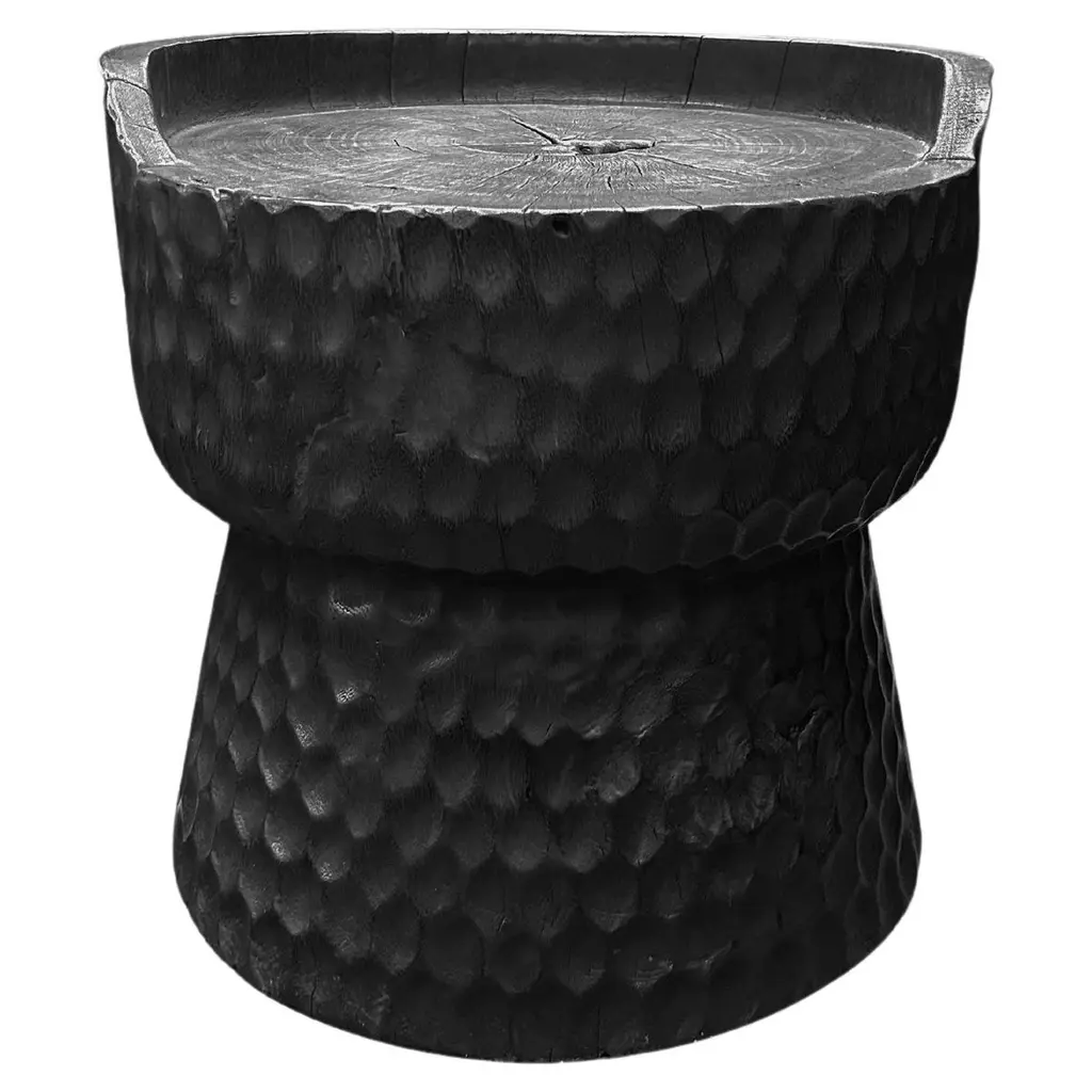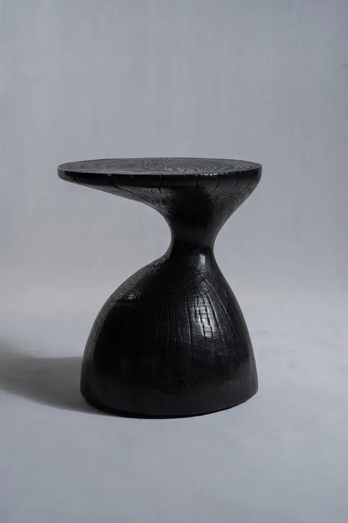 Sexy Neck - End table in solid wood (mango wood) monoxyl organic shape black color. Ideal furniture as a side table, end table for the living room (lamp, speaker, books, decorative objects), can be used as a stool or bedside table. The natural roughness of the wood (irregularities, rings and cracks) gives all the charm and singularity of this unique piece. Height: 45cm; diameter of the top or seat: 39cm.