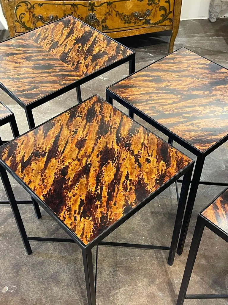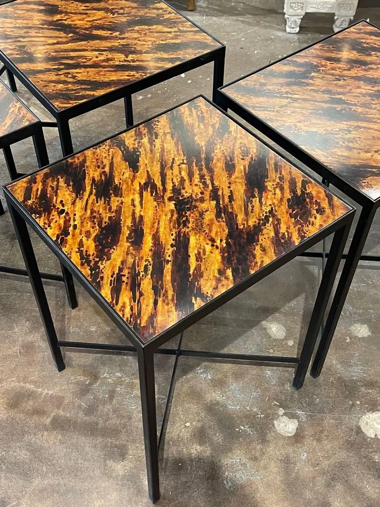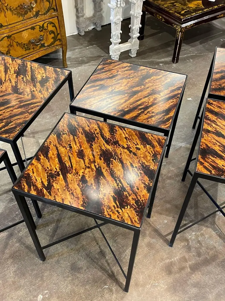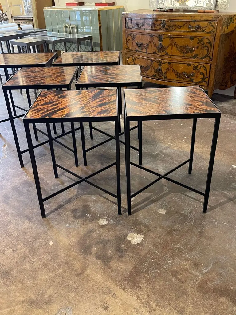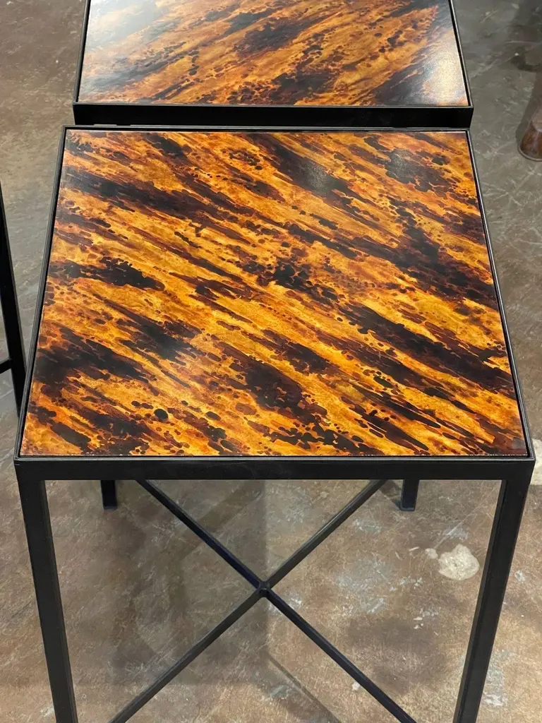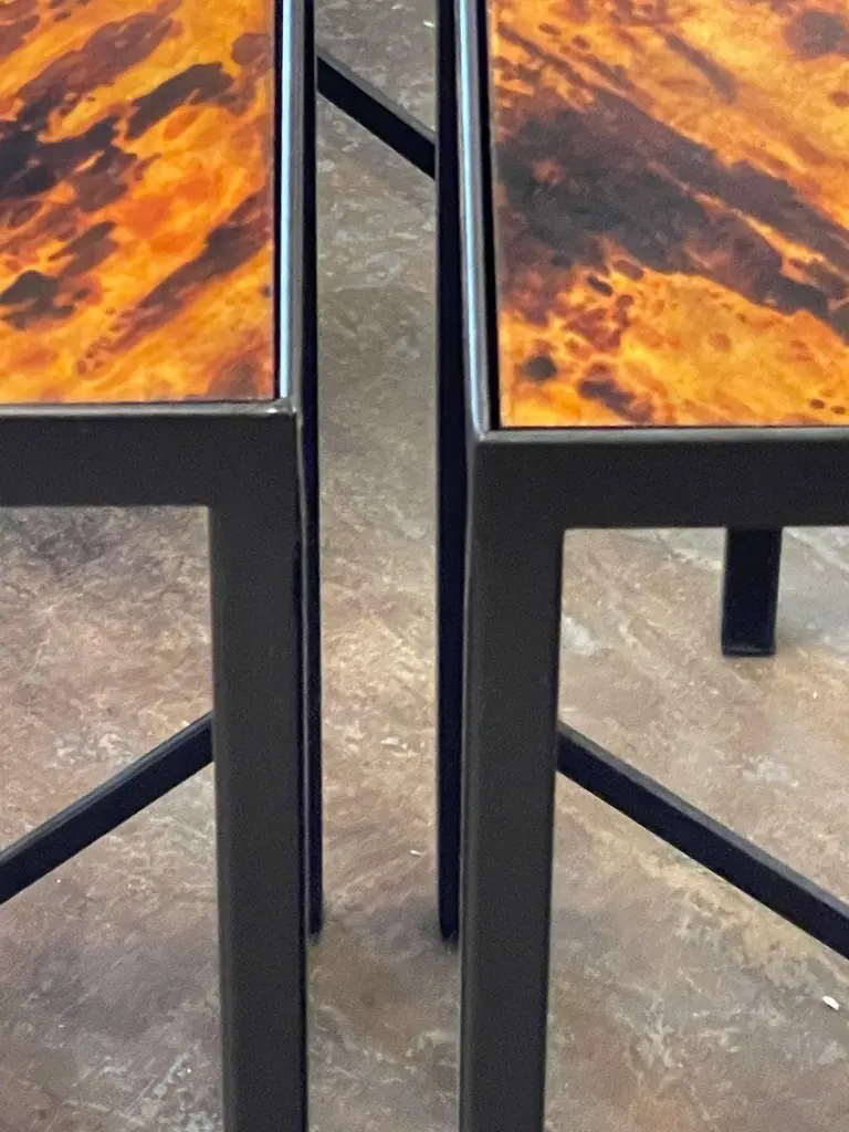 Great vintage steel side tables with faux tortoise tops. Creates a very style modern look! Note: The price listed is for one. And measurement listed is for the larger table. The other is slightly smaller.