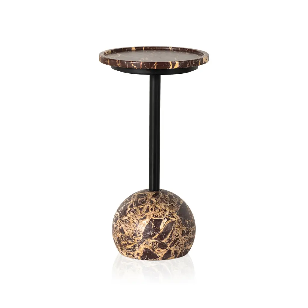 Indulge in the luxurious elegance of the Viola Accent Table from Four Hands. With its stunning marble foundation and sleek iron piping, this table adds a touch of sophistication to any room. The raised lip on the tabletop ensures practicality, while the unique design enhances the beauty of the natural marble. Elevate your space with this exquisite accent table. Highlights