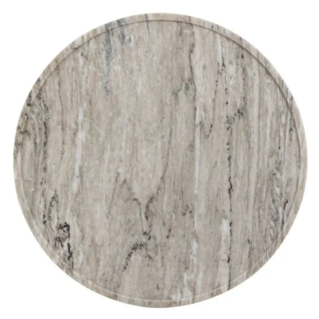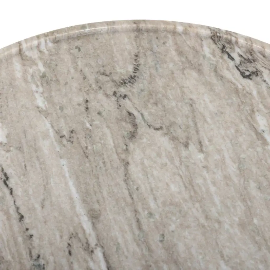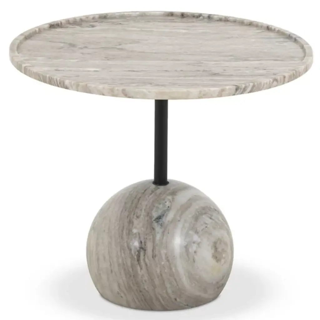 The Viola End Table from Four Hands balances white antique marble's sculptural weight against slim iron piping that supports a rounded tray-style top. The dramatic marble base anchors the piece while creating visual contrast with the delicate metal framework above. Natural veining in the white marble ensures each table expresses individual character, while the tray-style top contains objects within its raised edge. This mixed-material approach celebrates both stone's permanence and metal's structural precision in a single functional piece.