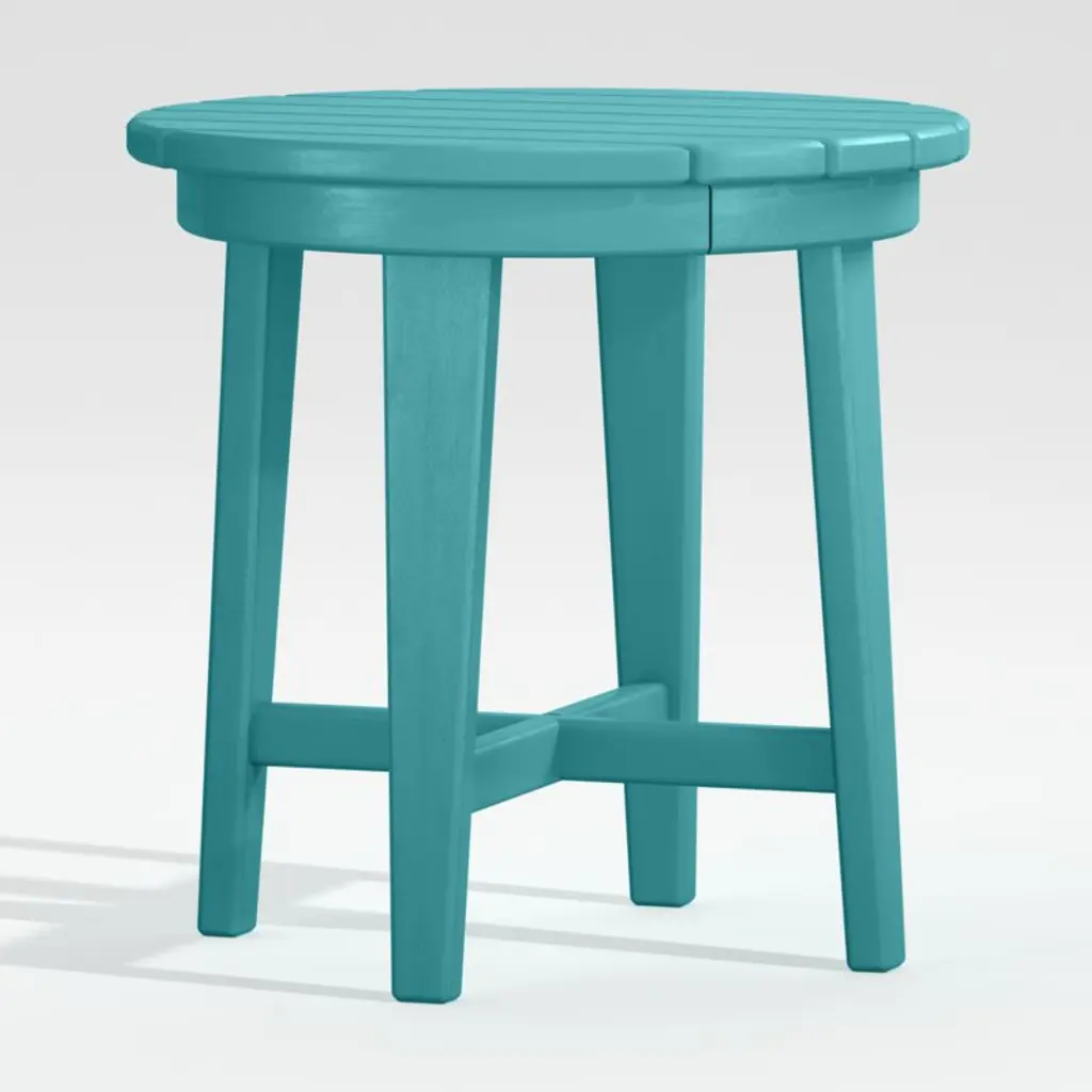 With its x-base and slatted top, this side table complements the iconic style of our Vista Adirondack chair. But the best part about Vista's exclusive design is the super-durable POLYWOOD® constructiona proprietary blend of plastics that's weather- and UV-resistant. Built to last (and last), the Caribbean blue side table partners with the coordinating chair to provide a ready landing spot for an icy-cold drink.