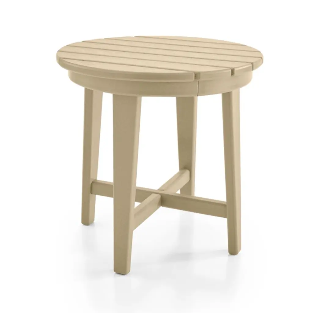 With its x-base and slatted top, this side table complements the iconic style of our Vista Adirondack chair. But the best part about Vista's exclusive design is the super-durable POLYWOOD® constructiona proprietary blend of plastics that's weather- and UV-resistant. Built to last (and last), the side table in a sand-colored neutral partners with the coordinating chair to provide a ready landing spot for an icy-cold drink.
