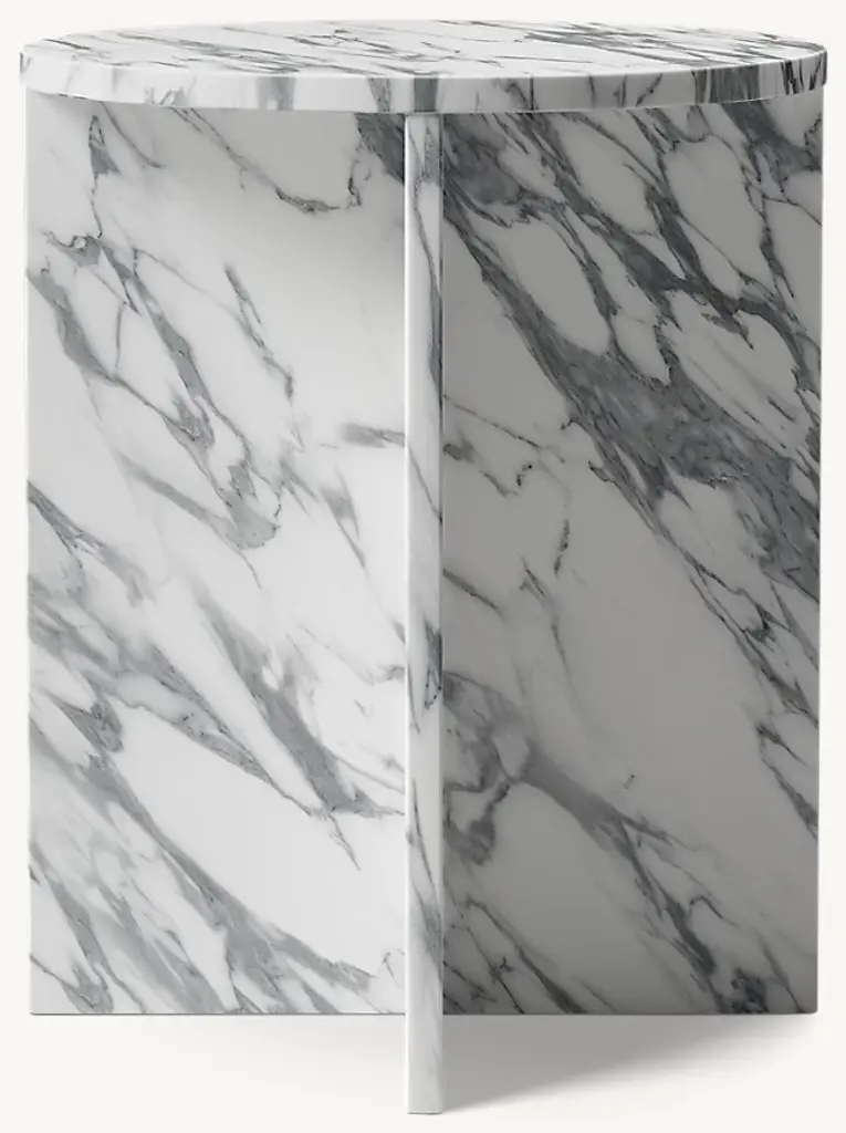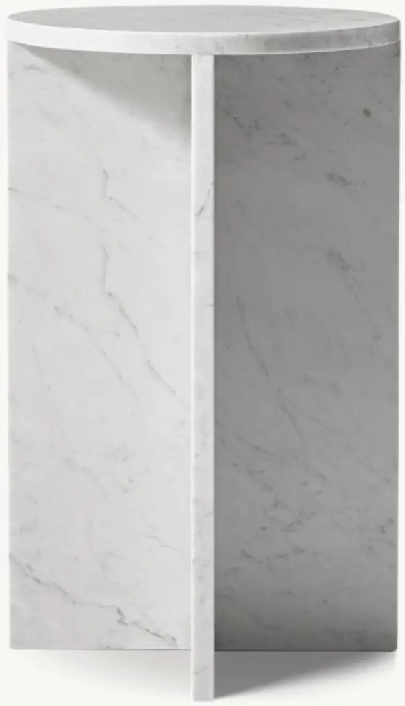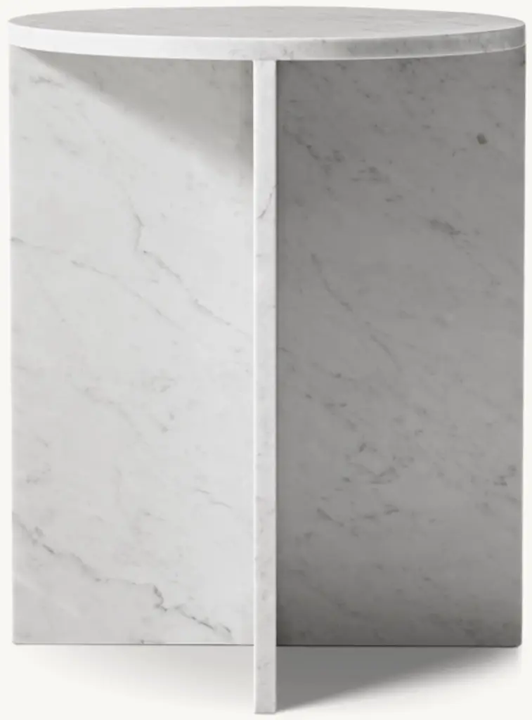 A study in bold geometric form, Vito's architectural profile presents a dynamic play of curves and perpendicular planes, its projecting top resting on a rotor-blade base. Sculpted from organic stone rich with veining and tonal variation, each piece is one of a kind.