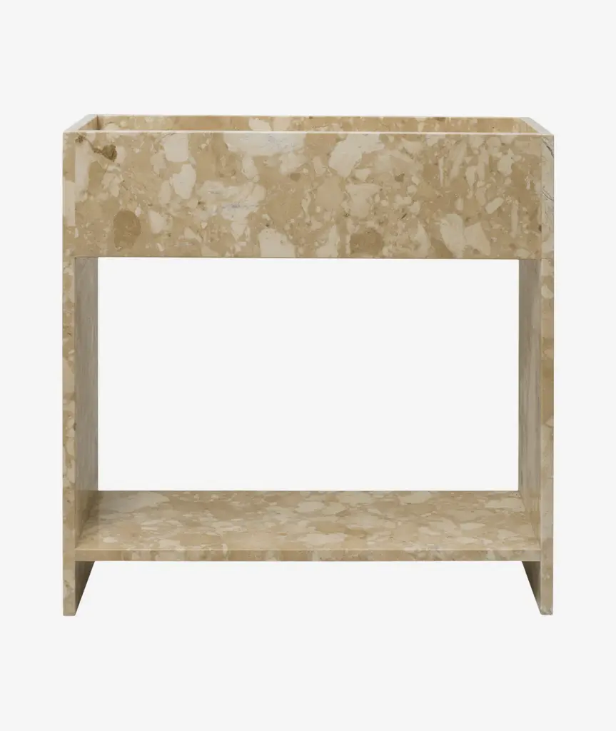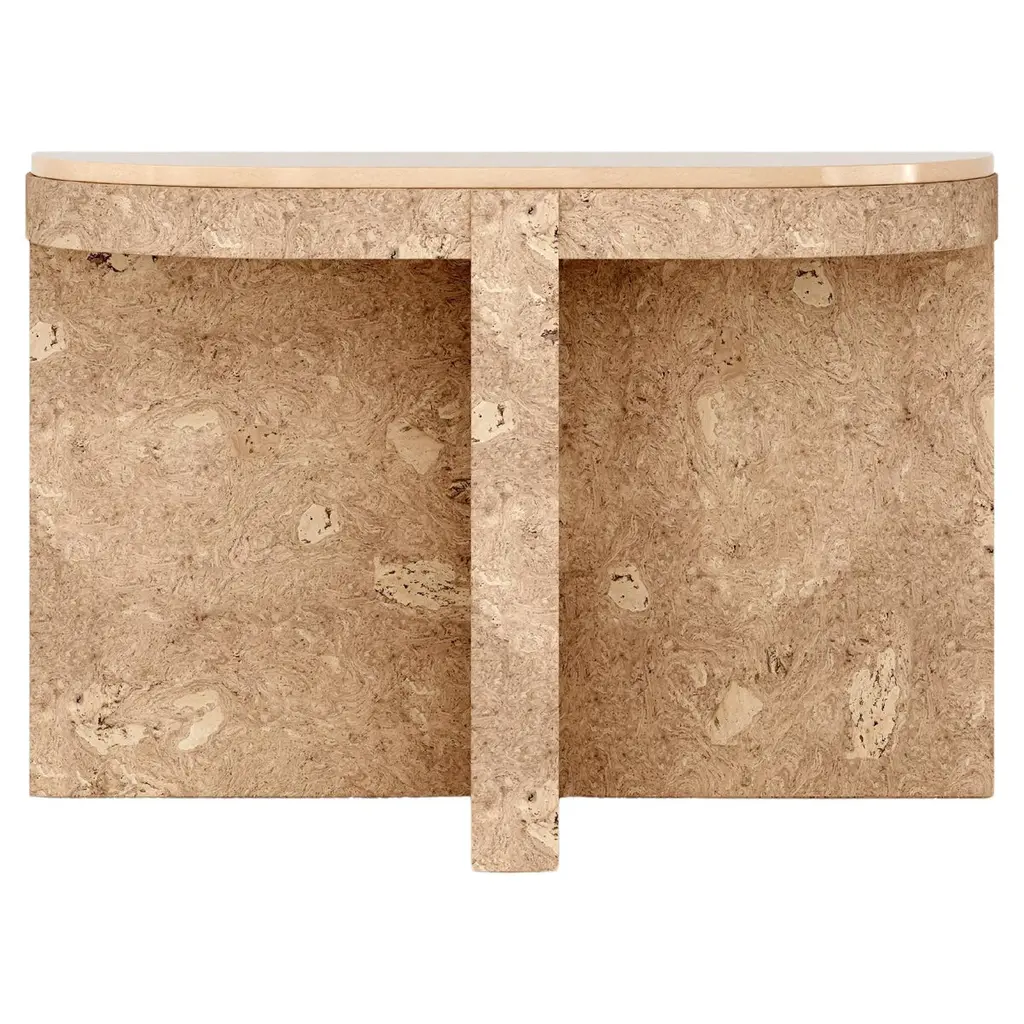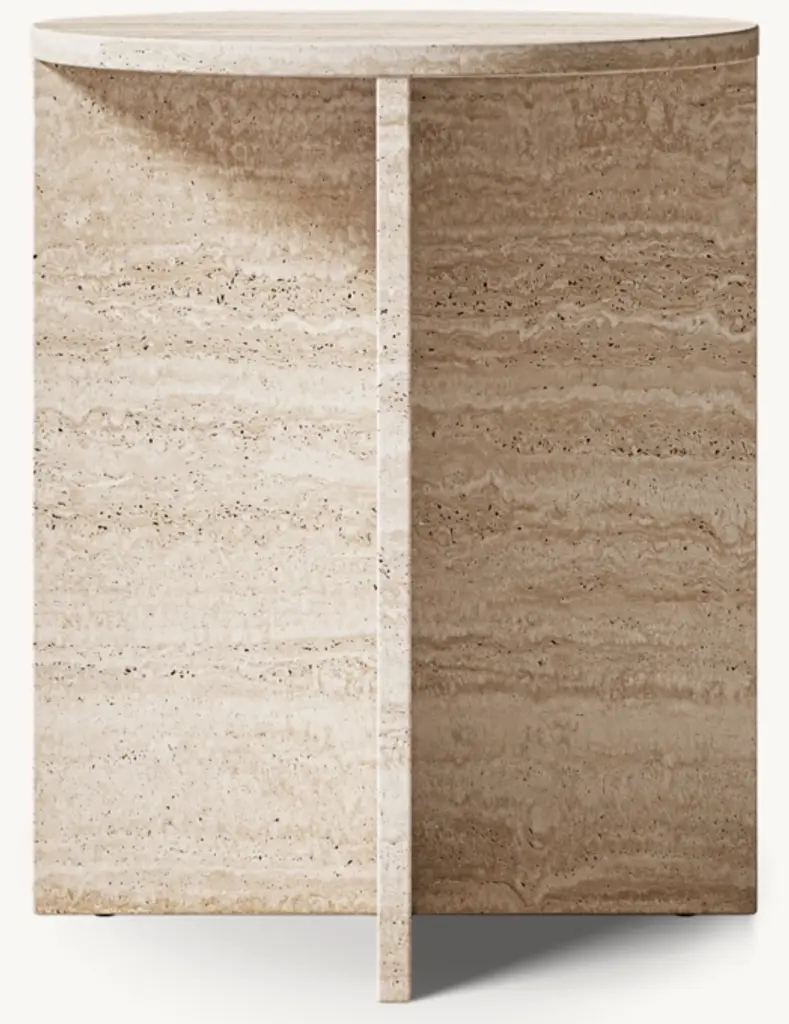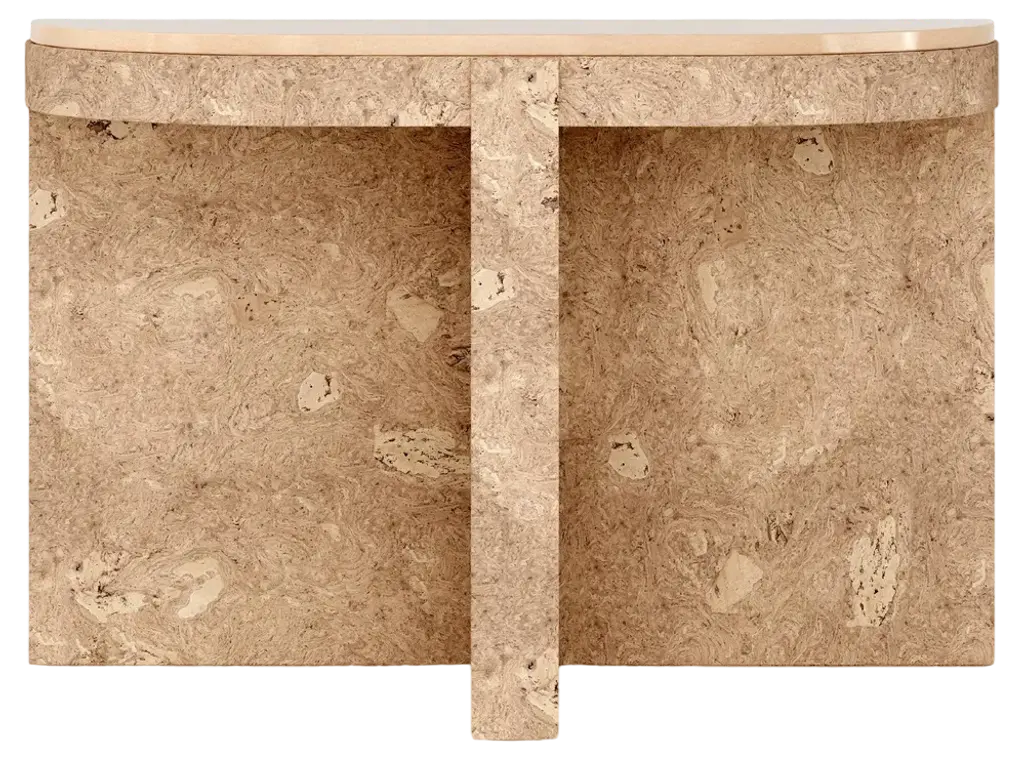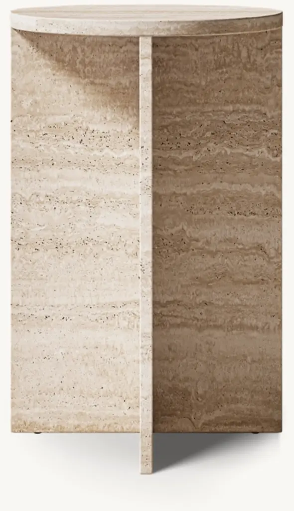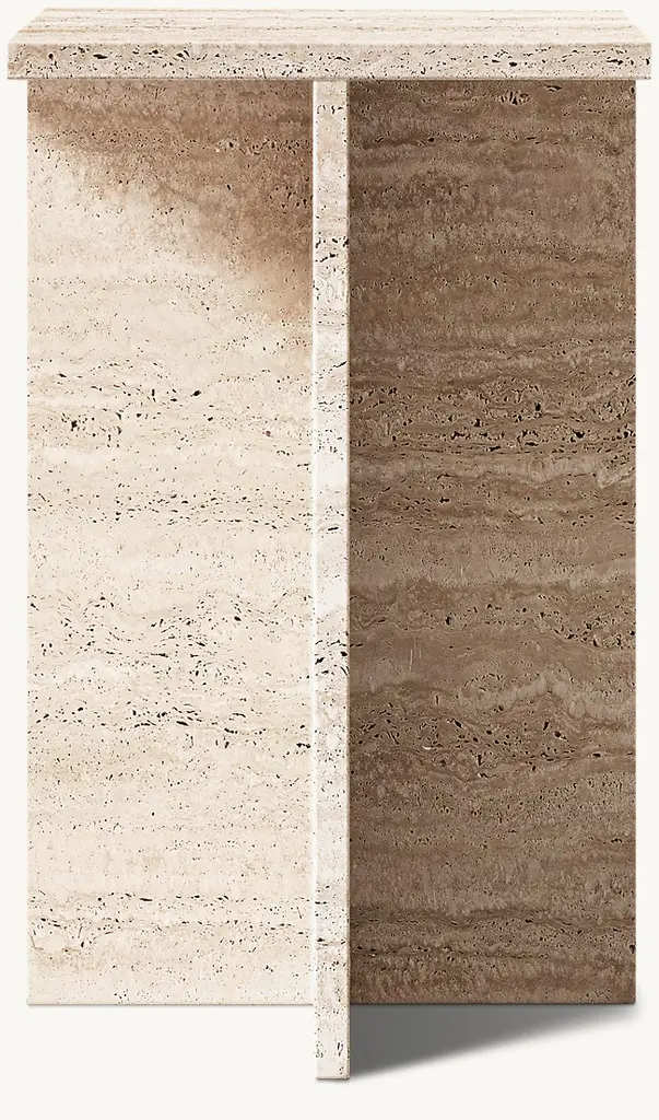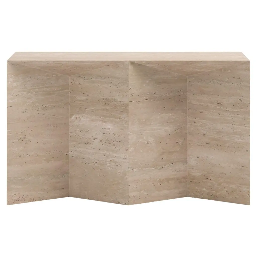 A study in bold geometric form, Vito's architectural profile presents a dynamic play of curves and perpendicular planes, its projecting top resting on a rotor-blade base. Sculpted from organic stone rich with veining and tonal variation, each piece is one of a kind.
