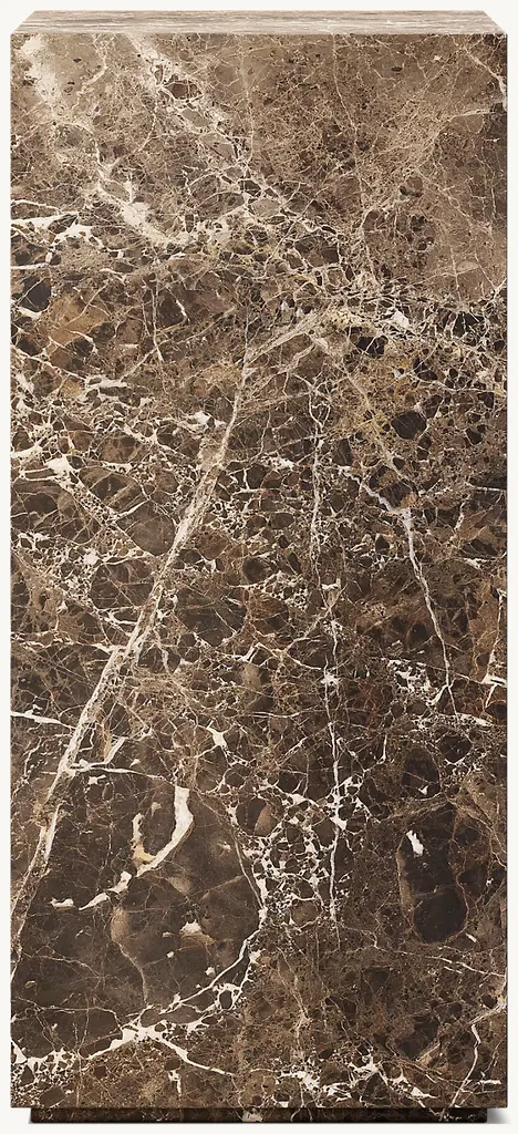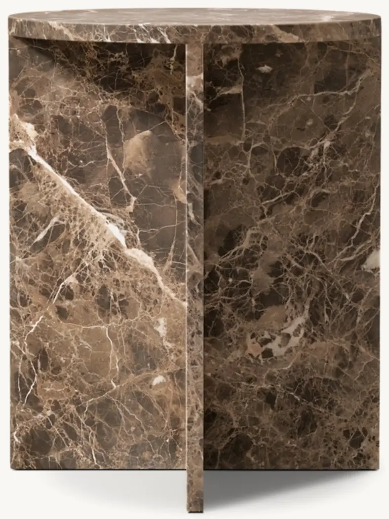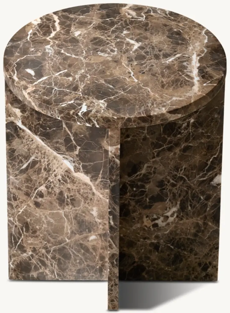 A study in bold geometric form, Vito's architectural profile presents a dynamic play of curves and perpendicular planes, its projecting top resting on a rotor-blade base. Sculpted from organic stone rich with veining and tonal variation, each piece is one of a kind.