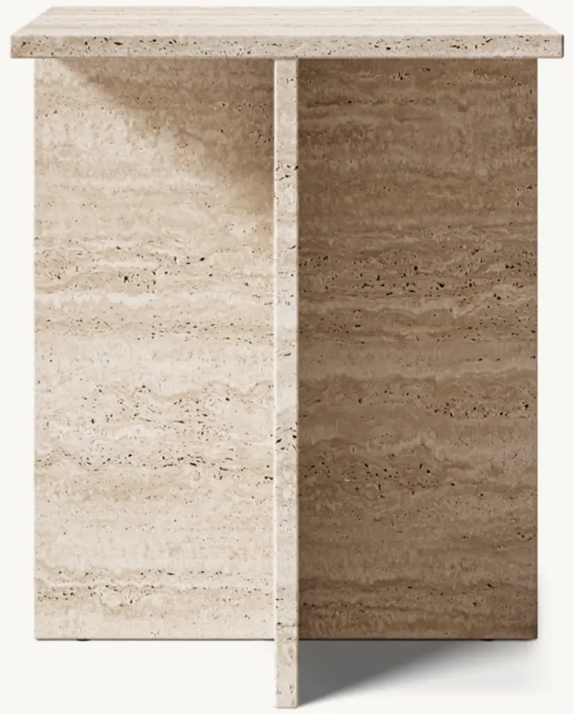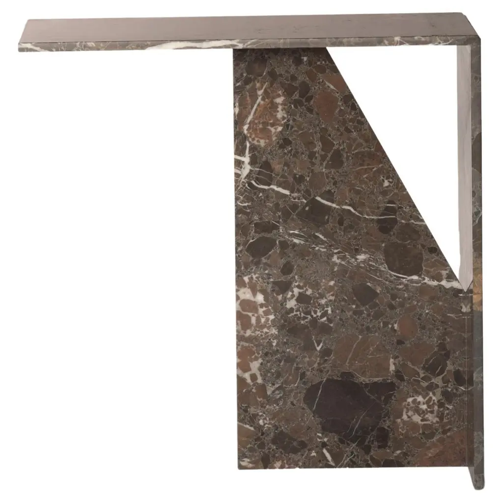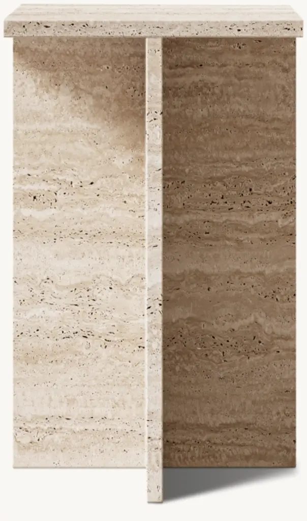 A study in bold geometric form, Vito's architectural profile presents a dynamic play of curves and perpendicular planes, its projecting top resting on a rotor-blade base. Sculpted from organic stone rich with veining and tonal variation, each piece is one of a kind.
