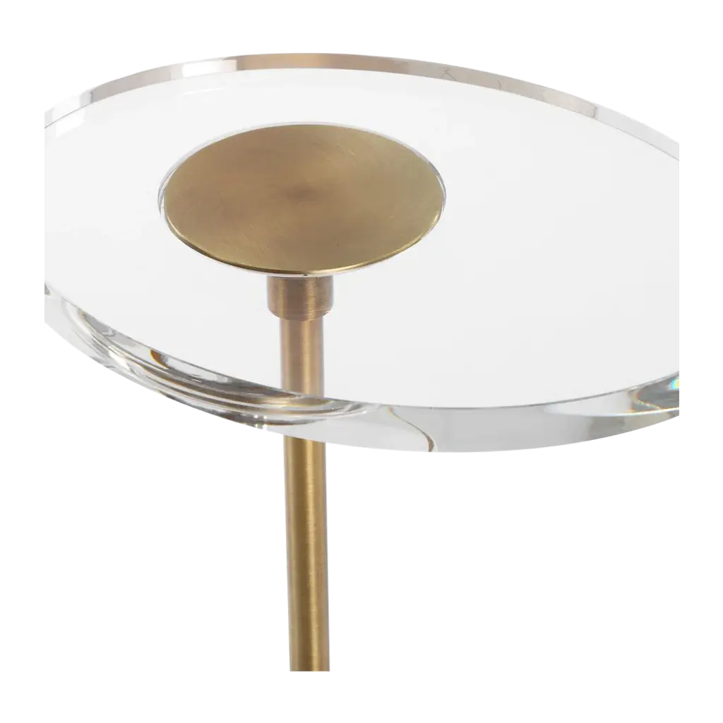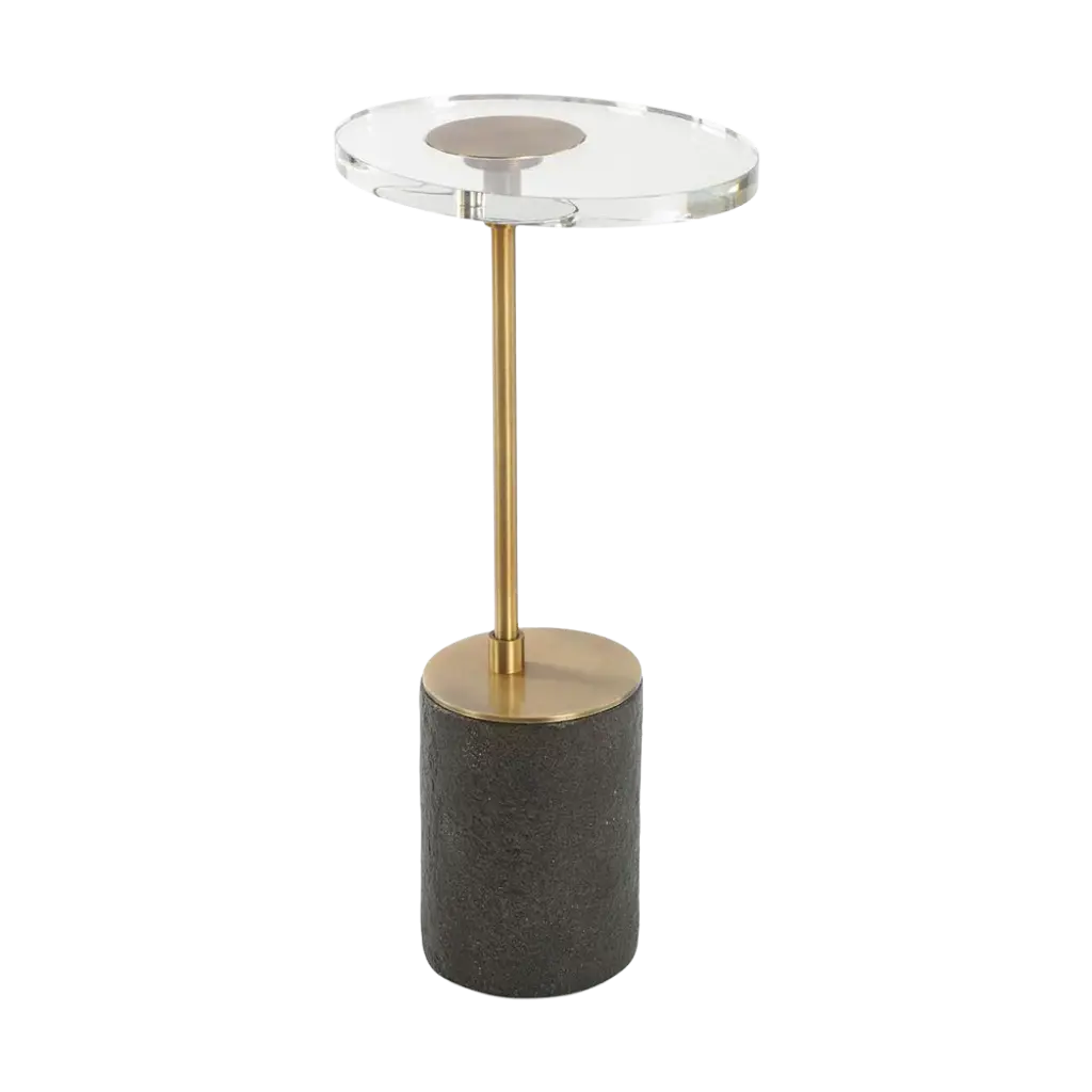 The Vitra Side Table is a sleek and sophisticated accent piece that combines modern design with luxurious materials. Featuring an oval transparent top that exudes a light, airy feel, this table is supported by a slender, polished pedestal, adding a touch of elegance and warmth. The base features a textured dark stone, providing a grounding contrast and ensures stability. Ideal for placement next to a sofa or chair, the Vitra Side Table serves as a versatile and stylish surface for decor or essentials.