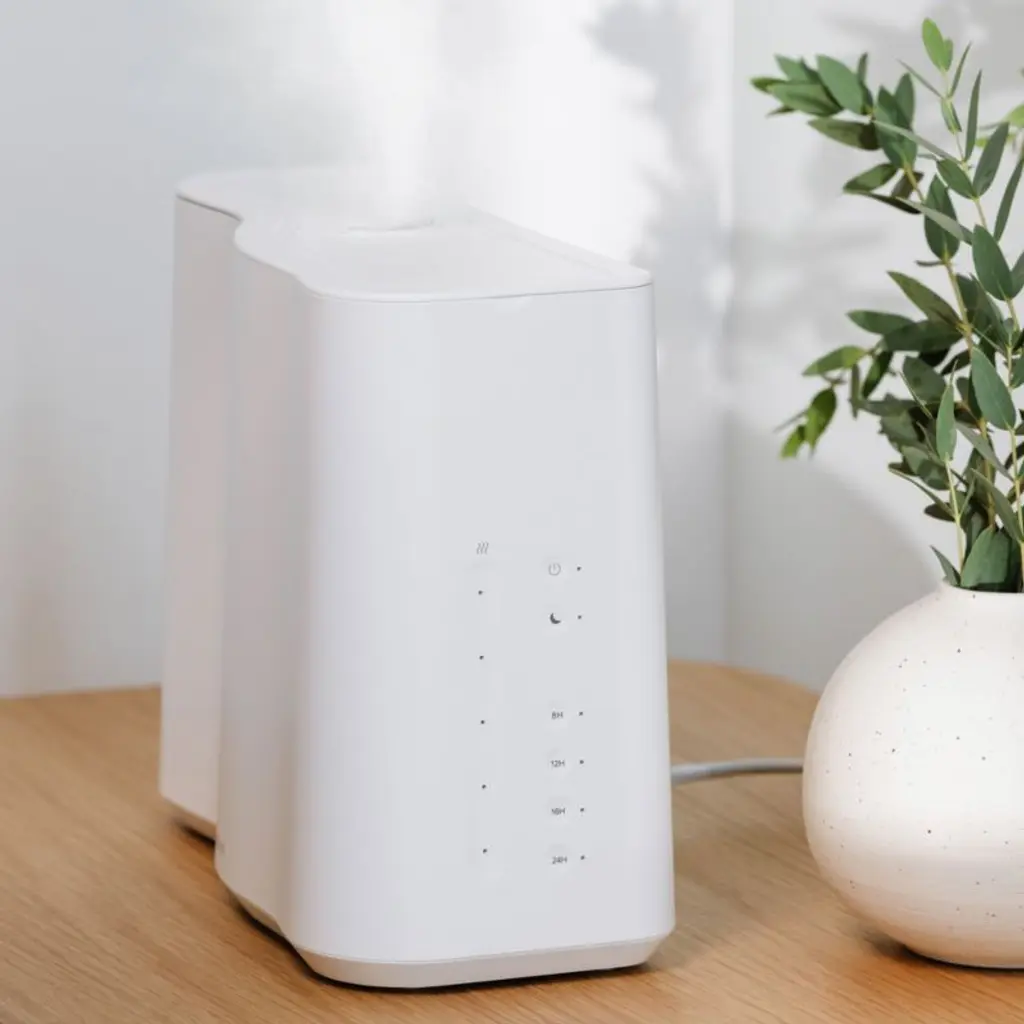 Add the ideal amount of moisture to the air with this decor-friendly humidifier. Designed with a slender, wavy silhouette in cloud white, it fits easily on many nightstands and side tables. The rotating spout releases a cool mist with a whisper-quiet operation. Set the timer for 8-, 12-, 16- or 24-hour run times, and the humidifier will turn off automatically when the time or water runs out.
