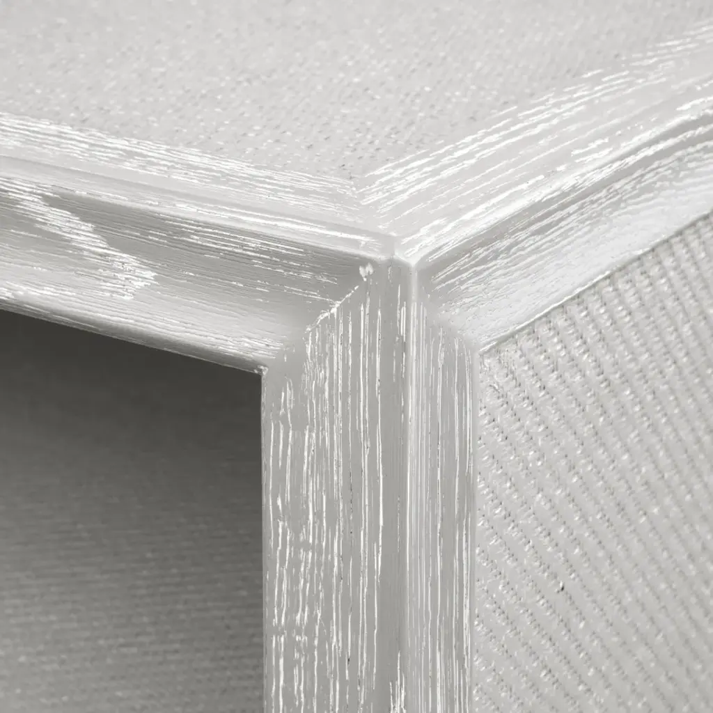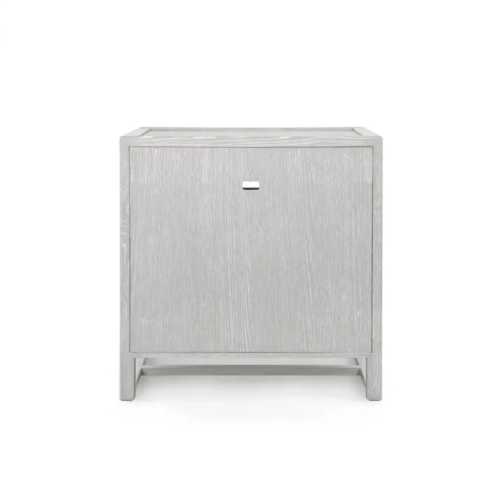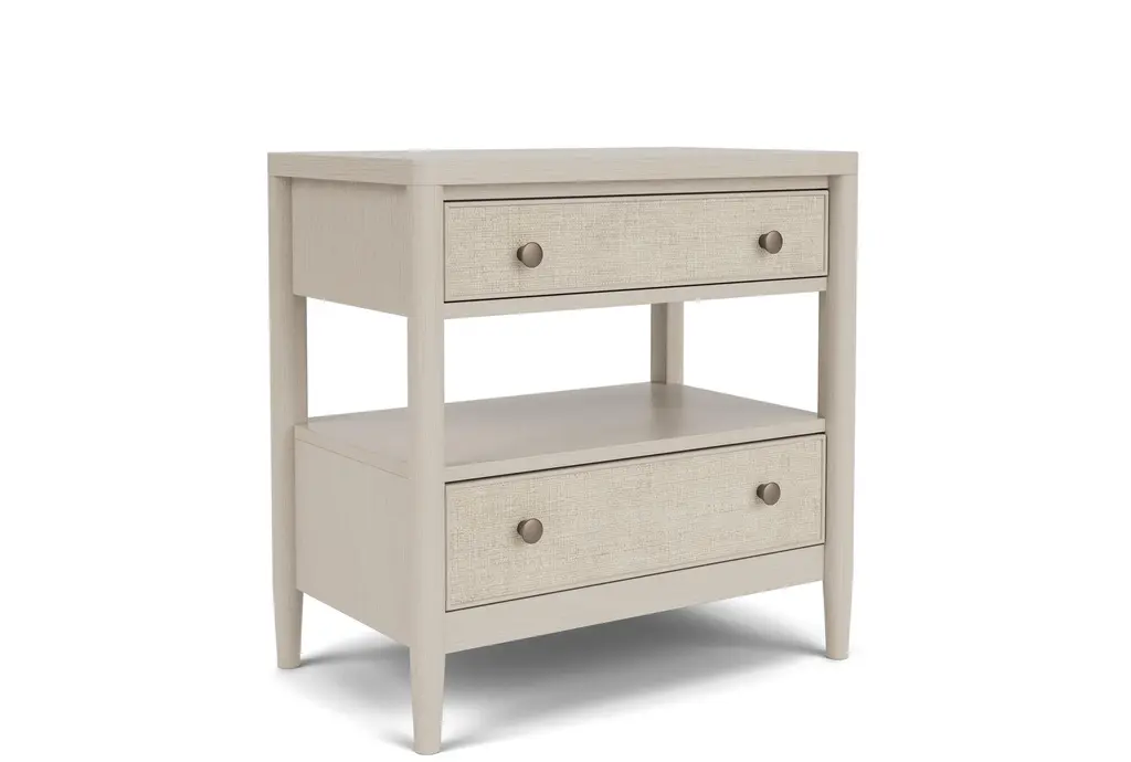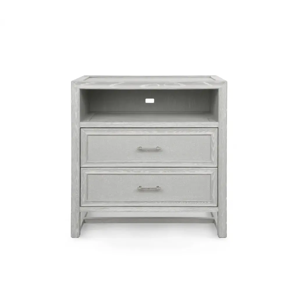 Contemporary craftsmanship shines with our Vivian collection. A line crafted from Clear Lacquered Cerused Oak, gray-washed grasscloth panels, and hand-cast polished nickel pulls. Two drawers float above the hand-coved base giving the piece a sense of weightlessness. A traditional shape modernized by thoughtful details, the Vivian 2-Drawer Side Table would be a lovely accent in any living room, sunroom, office, or bedroom.