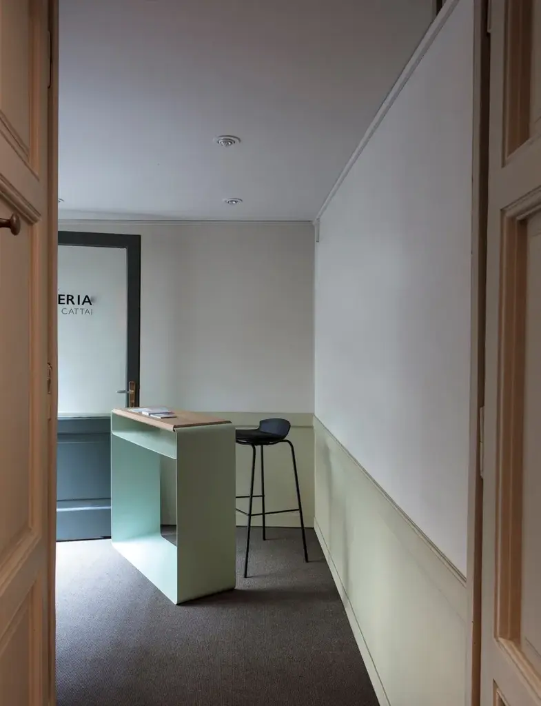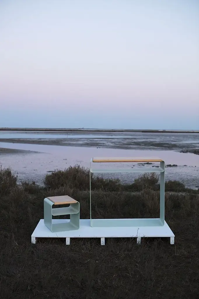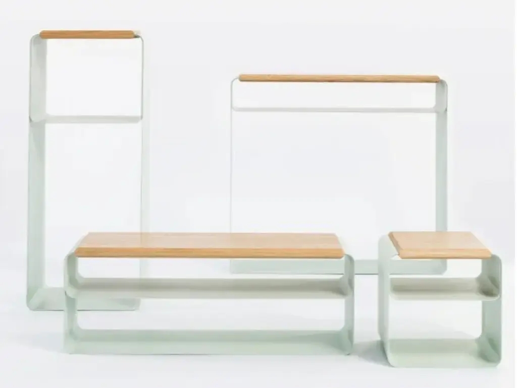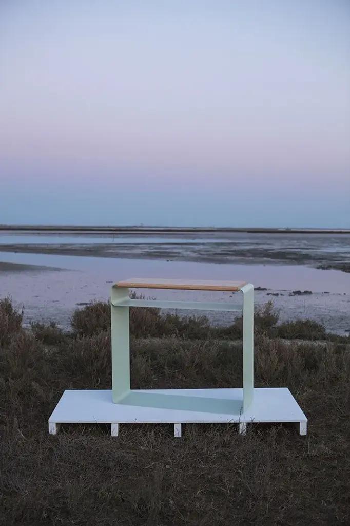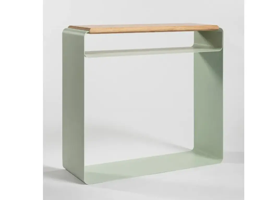 Vodo is a softly shaped console with a solid wood shelf and a folded sheet metal shelf underneath. Available in different colours and essences. With its linear design, it emphasizes the environment in which it ts. Ideal for use in the of ce, home or work environment. An everchanging object: transparent and ethereal when viewed from the front, material and solid when viewed from the side.Vodo, a line of furnishings that redefines interior landscapes. Folded metal plates, voids that create windows for living spaces, sculptures that become benches, bookcases, bedside tables and consoles. Essential forms provided by architecture.