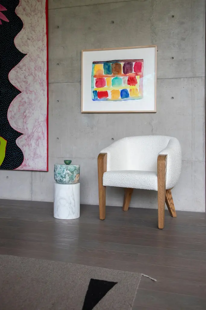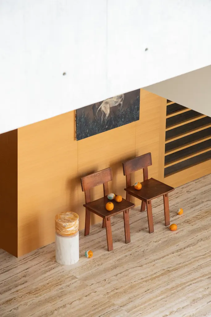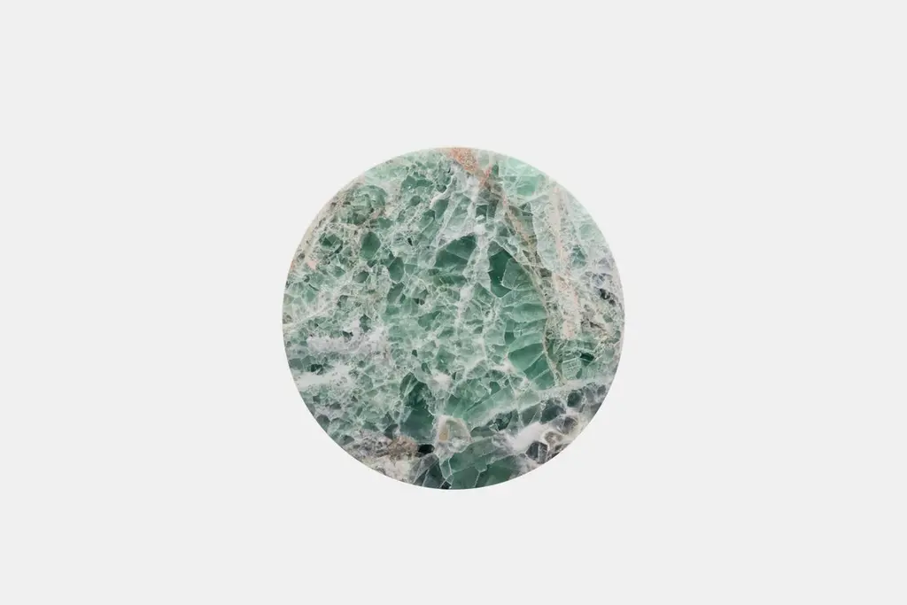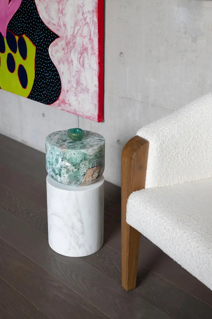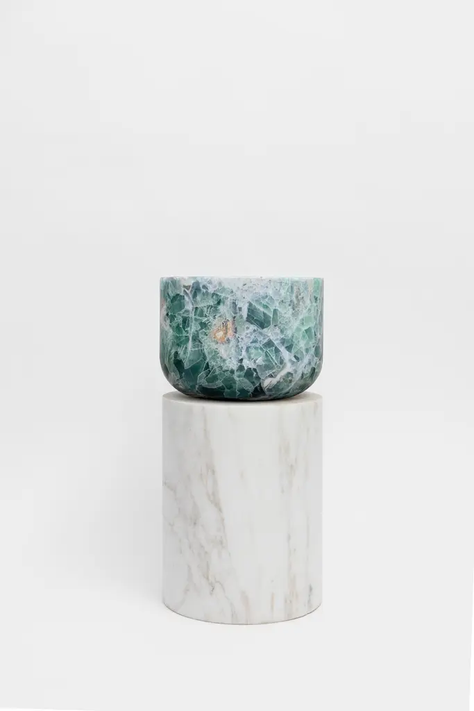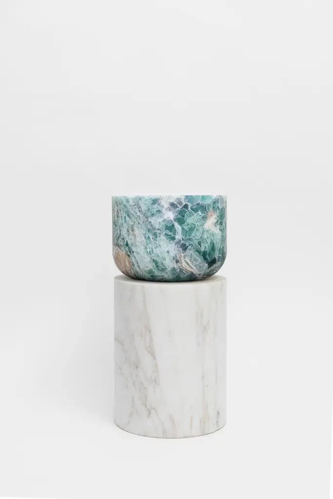 Materials: Golden Calacatta marble and fluoriteIndoors and outdoorsSide table / StoolWhile, in principle, marble bears not a volcanic origin, the veiny, fine-grained Yule marble employed for this variation of Sten Studio’s distinctive stools is quarried from the profound interior of the Elk Mountains of Western Colorado. Due to this highly peculiar source –the very entrails of a mountain range– this kind of marble has accrued its current shape, from prehistoric times onward, by contact metamorphism. That is, the rock mineral is changed, as its texture, by the heat provoked due to contact with magma. The outcome is a distinctive tinged appearance that contrasts with the unmasked porosity of the grey lava stone.Driven by the perfection of geometry, the stools follow a positive/negative assemblage: The marble is elevated at the center of the base and, by way of gravity, slides into the natural colored stone, fitting into it as a piece from a puzzle. The harmony between their shapes binds them and creates a unit that will defy the passing of time.Designed and handmade in Mexico, Volcanic Shades of Marble furthermore, the stools double as a tribute to the Mexican territory and its volcanic belt region, home to active and dormant entities and several lakes of a shared origin. Marble and onyx are natural materials; variations in markings and coloration are normal, adding to the unique beauty of each piece. Natural hairline cracks may also occur within the stone. These are inherent characteristics of marble and are not considered flaws.