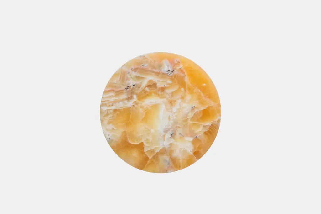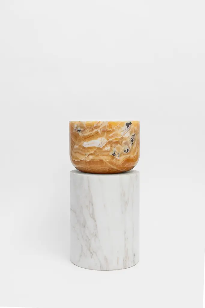 Materials: Golden Calacatta marble and pineapple onyxIndoors and outdoorsSide table / StoolWhile, in principle, marble bears not a volcanic origin, the veiny, fine-grained Yule marble employed for this variation of Sten Studio’s distinctive stools is quarried from the profound interior of the Elk Mountains of Western Colorado. Due to this highly peculiar source –the very entrails of a mountain range– this kind of marble has accrued its current shape, from prehistoric times onward, by contact metamorphism. That is, the rock mineral is changed, as its texture, by the heat provoked due to contact with magma. The outcome is a distinctive tinged appearance that contrasts with the unmasked porosity of the grey lava stone.Driven by the perfection of geometry, the stools follow a positive/negative assemblage: The marble is elevated at the center of the base and, by way of gravity, slides into the natural colored stone, fitting into it as a piece from a puzzle. The harmony between their shapes binds them and creates a unit that will defy the passing of time.Designed and handmade in Mexico, Volcanic Shades of Marble furthermore, the stools double as a tribute to the Mexican territory and its volcanic belt region, home to active and dormant entities and several lakes of a shared origin.Marble and onyx are natural materials; variations in markings and coloration are normal, adding to the unique beauty of each piece. Natural hairline cracks may also occur within the stone. These are inherent characteristics of marble and are not considered flaws.