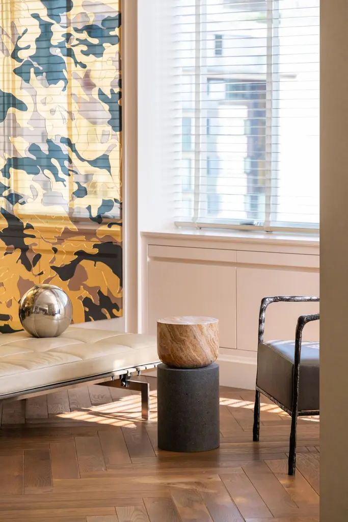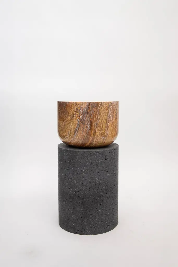 Materials: Lava stone and pineapple onyxIndoors and outdoorsSide table / StoolMarble and onyx are natural materials; variations in markings and coloration are normal, adding to the unique beauty of each piece. Natural hairline cracks may also occur within the stone. These are inherent characteristics of marble and are not considered flaws.Through an abstract geometric language where cubes and cylinders playfully alternate, these stools represent the millenary connections existing inside the Earth; they are a visual metaphor for volcanoes, where craters open fault lines into the Earth’s core, exposing the brightly colored molten lava inside. Made of blocks of a variant of lava stone, and insertions carved out of various minerals, they feature materials which originated in a far distant geological era, embodying a timespan which the human mind can hardly understand.While the base is made of a material which is an actual product of volcanic activity, the variants of the remaining stones – Red travertine marble, blue calcite, and pineapple onyx– refer to the different stages lava transitions into, from hot crimson fluid, to cold blue rock at the bottom of volcanic lakes.Designed and handmade in Mexico, Volcanic Shades furthermore, the stools double as a tribute to the Mexican territory and its volcanic belt region, home to active and dormant entities and several lakes of a shared origin.