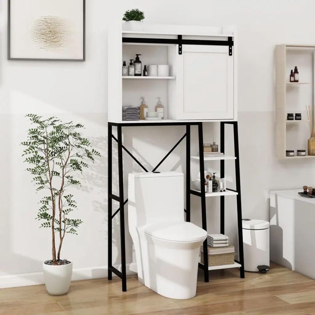 Vynxaria Over The Toilet Storage Cabinet, Bathroom Shelves Over Toilet With Sliding Barn Door,adjustable Shelves And Side Storage Rack-white