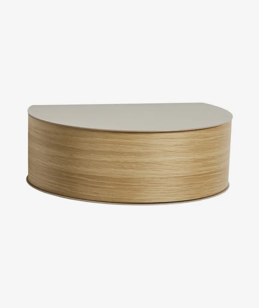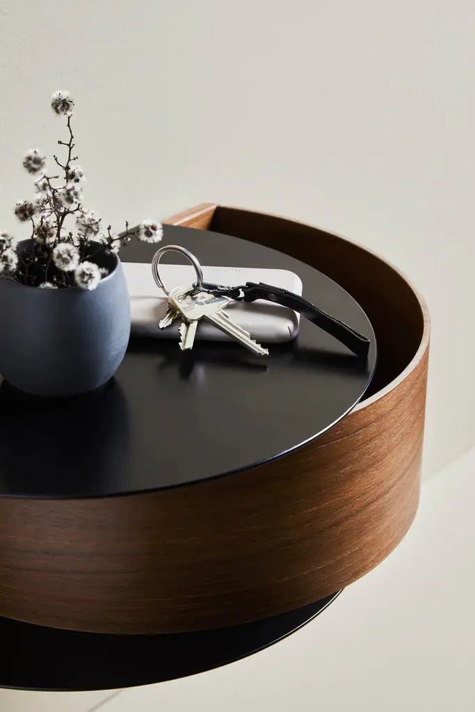 Wallie beautifully combines bent oak with solid black metal creating an elegant wall-mounted drawer. The bracket embraces the magnetic wood drawer making the design both minimalistic and functional. Wallie is perfect for storing small everyday essentials in the hallway or as a bedside table in the bedroom.