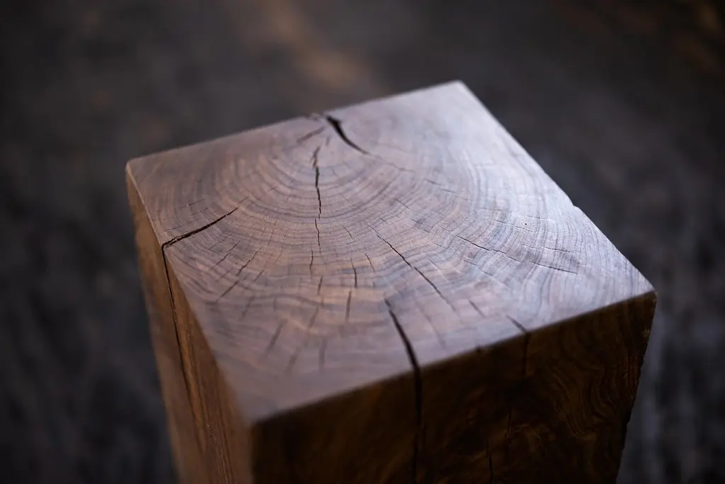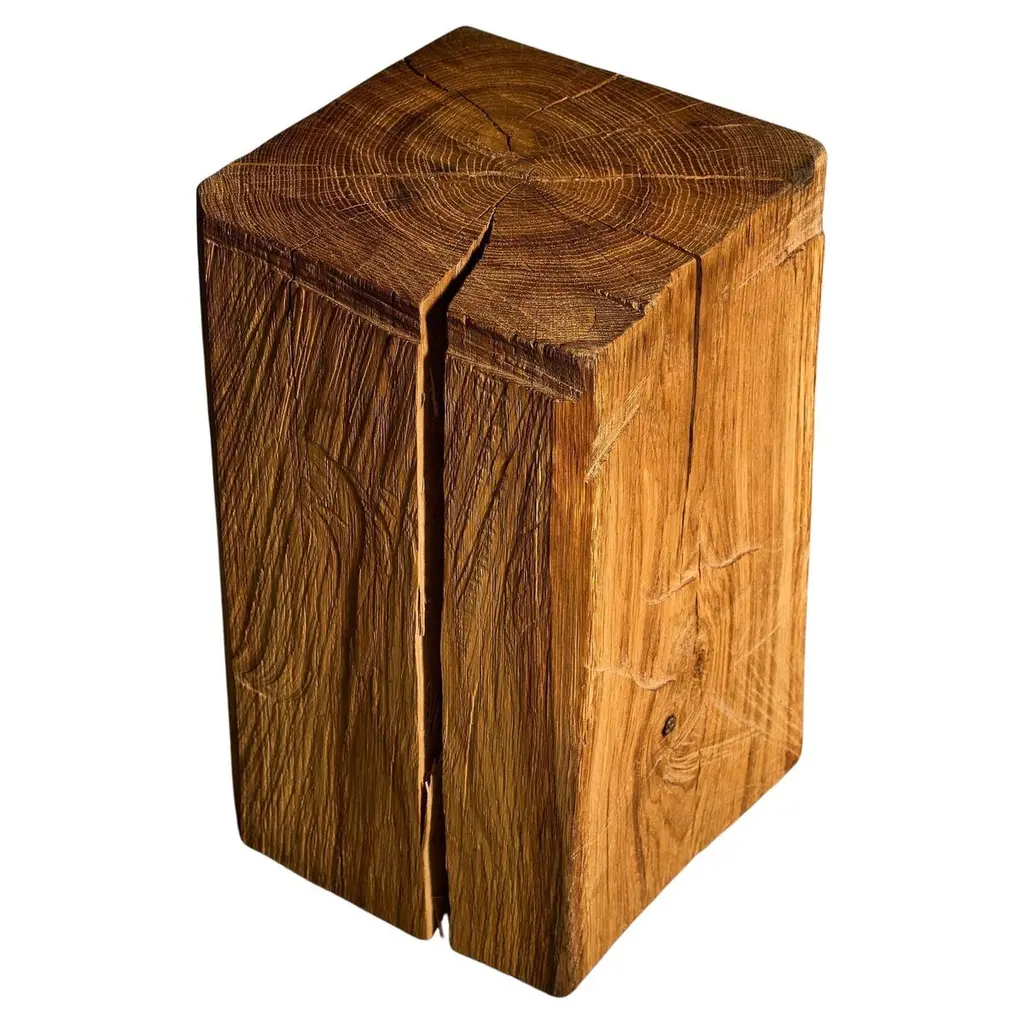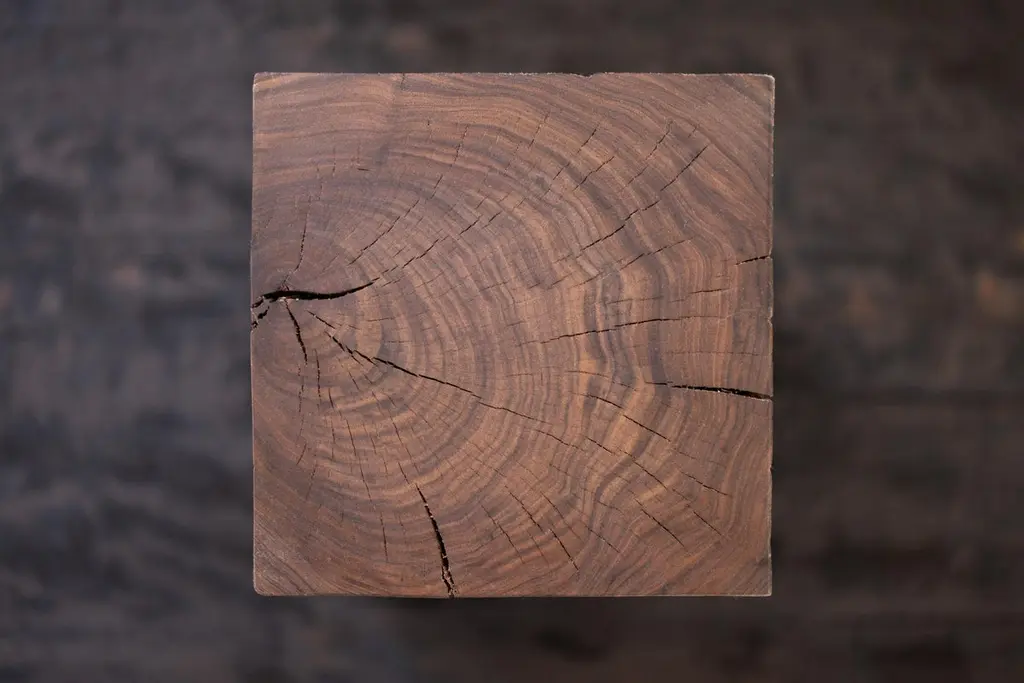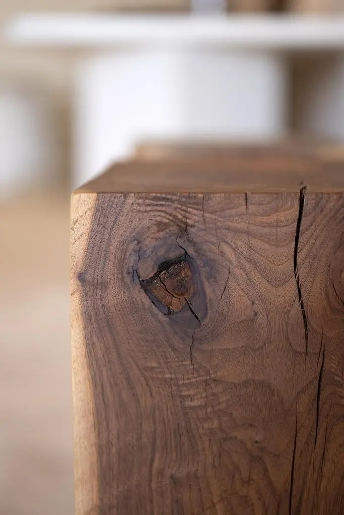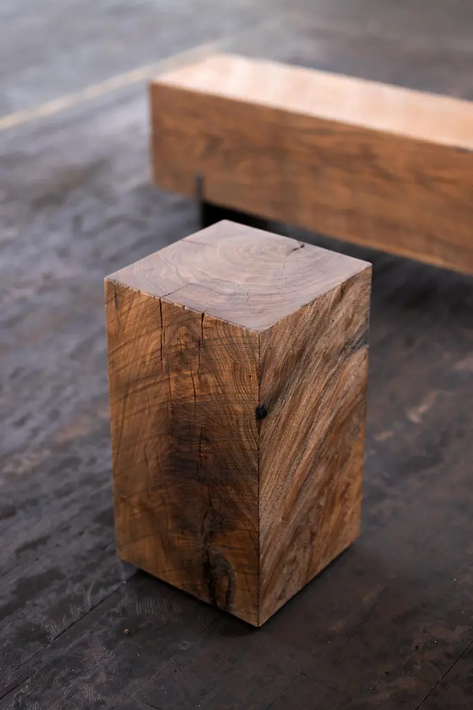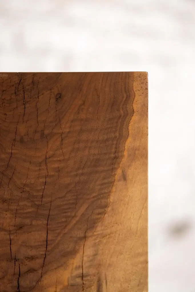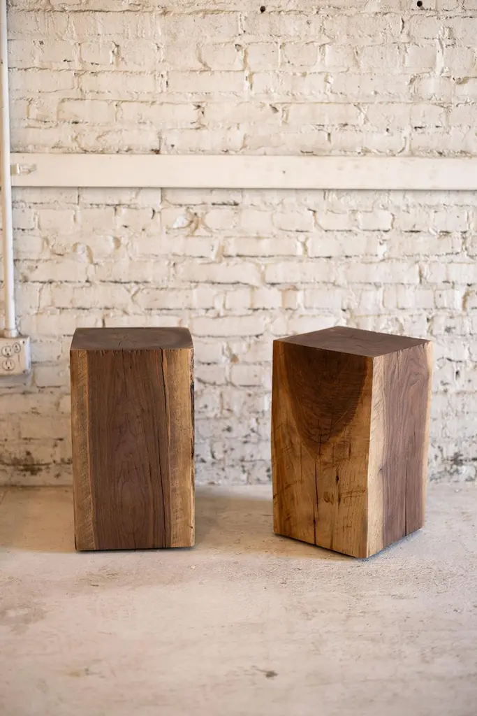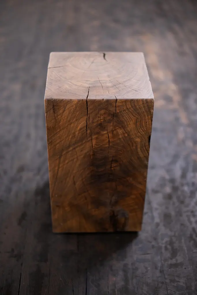 Precious and versatile, this version of the Hyo Table is hand crafted from solid walnut. The unique beauty of urban walnut as a solid volume makes a statement as well as offering unique grain and stunning color to admire for hours.Sealed with a clear, low sheen danish oil finish, these wood cube side tables are great as coffee tables, side tables, occasional tables or bedside tables. They are sturdy enough to use as casual seating as well. There is no stain, so the color may vary. Heartwood and sapwood in walnut provide a range of colors. The urban wood features variations inherent to salvaged materials such as a rustic distressed finish, visible knots, hairline cracks and natural stains, which may result in hue variations, rubbed edges, or other antique-like characteristics, that are part of the rustic beauty of these side tables. If the finish cracks, you may see some raw wood underneath. Natural materials and will age over time and with exposure to the elements—the more exposure, the quicker they will age. Expansion and contraction due to temperature variability may occur. A field-to-studio company, Alabama Sawyer repurposes the finest wood species, reclaimed from our local urban forests, to create one of a kind furniture pieces and accessories for the home or business. Urban wood has character. Walnut pieces may contain color variations ranging from deep brown to light yellow. Character can include variations in color and grain, small pin knots, evidence of historical intrusion. There may be cracks or knots that we fill, patch or join in a considered and artful way at the makers discretion. We look at every slab and decide what needs a patch or epoxy or both. Case by case, one may be more effective and better for the furniture, aesthetically, structurally, and for our process. Please note: If a specific tool, like a patch, is not desired, please specify this when ordering. This may require procuring different lumber which can alter costs. If color adjustment is requested on a completed piece after the fact, we will charge additionally for a custom stain.Pads or glides under legs help protect your floors.
