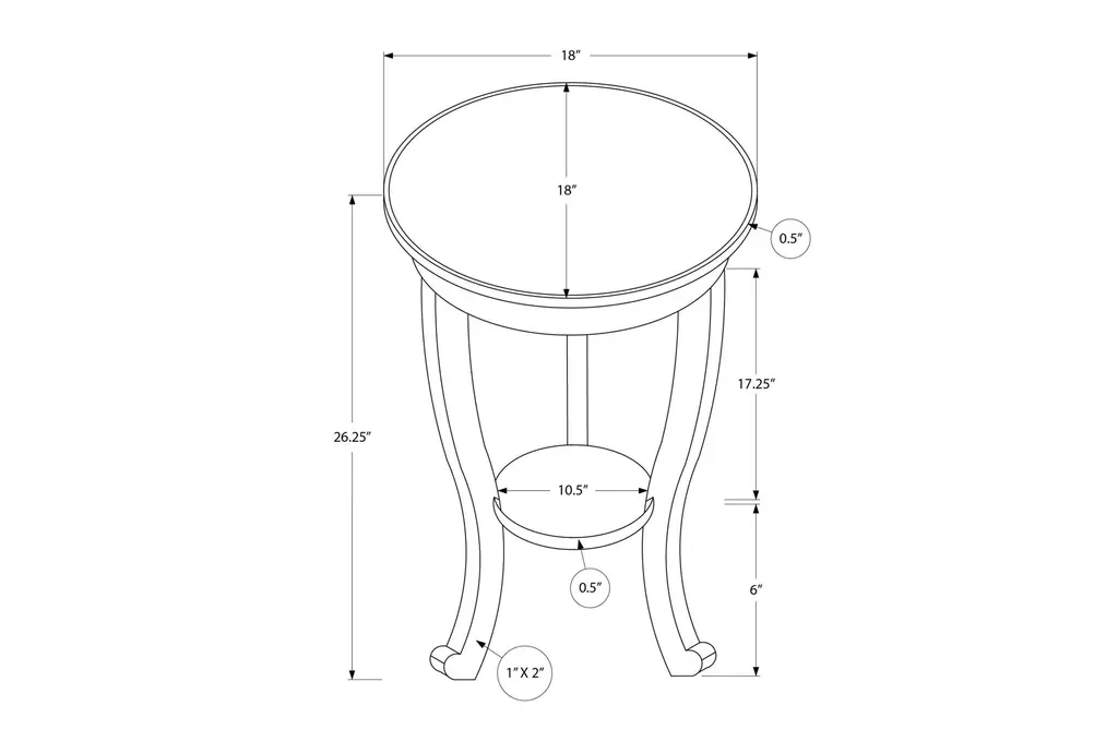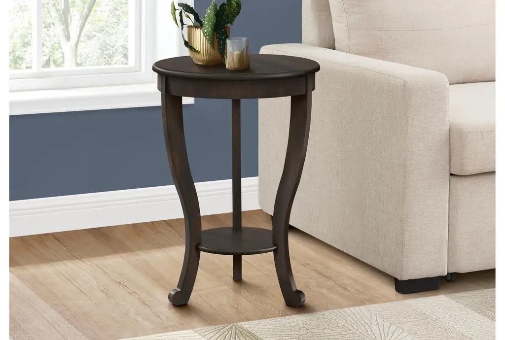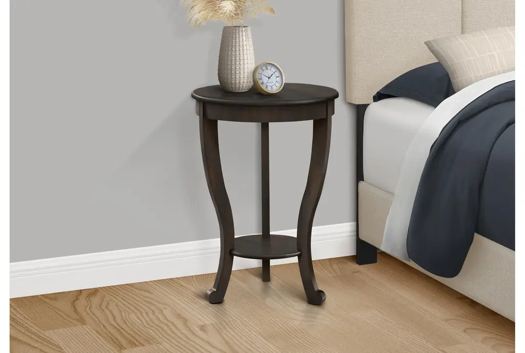 This fashionable and classically designed round accent table, with a dark walnut brown veneer finish, adds an elegant touch to any room. This design also serves as the perfect bedside table.