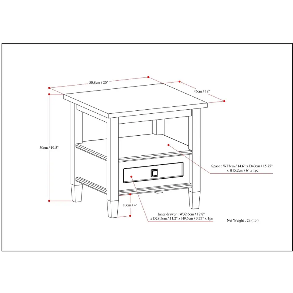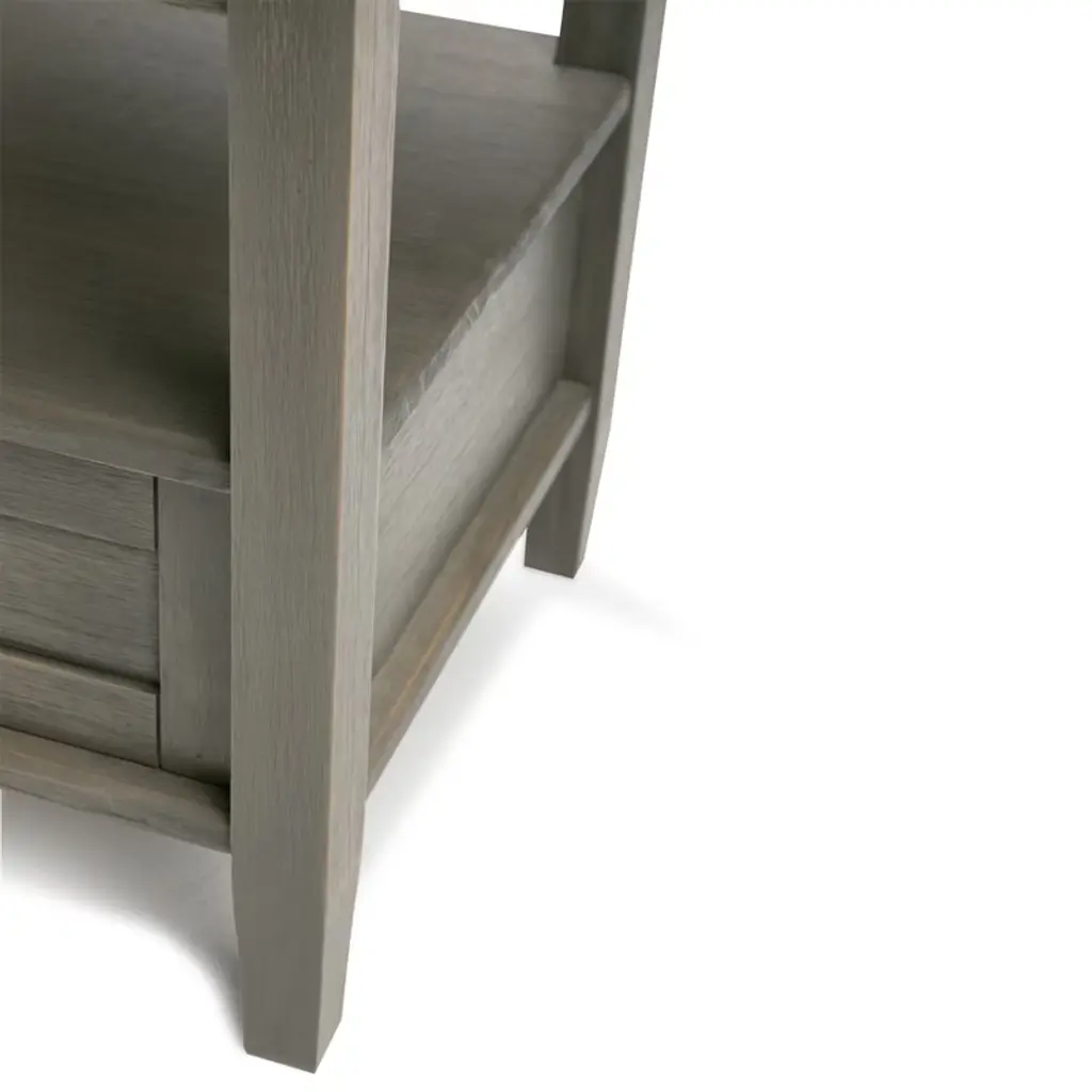 Handcrafted with care using the finest quality solid woodHand-finished with a Farmhouse Grey finish and a protective NC lacquer to accentuate and highlight the grain and the uniqueness of each piece of furniture.Multipurpose table can be used as an end table or side table. Looks great in your living room, great room, condo or bedroomFeatures one bottom drawer with metal drawer glides and large open shelf for storageTransitional design features brushed nickel knob, square tapered legs and square edged table topAssembly Required