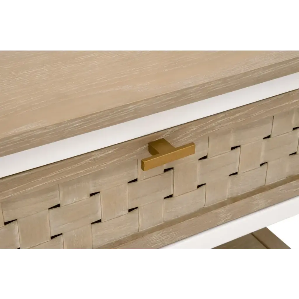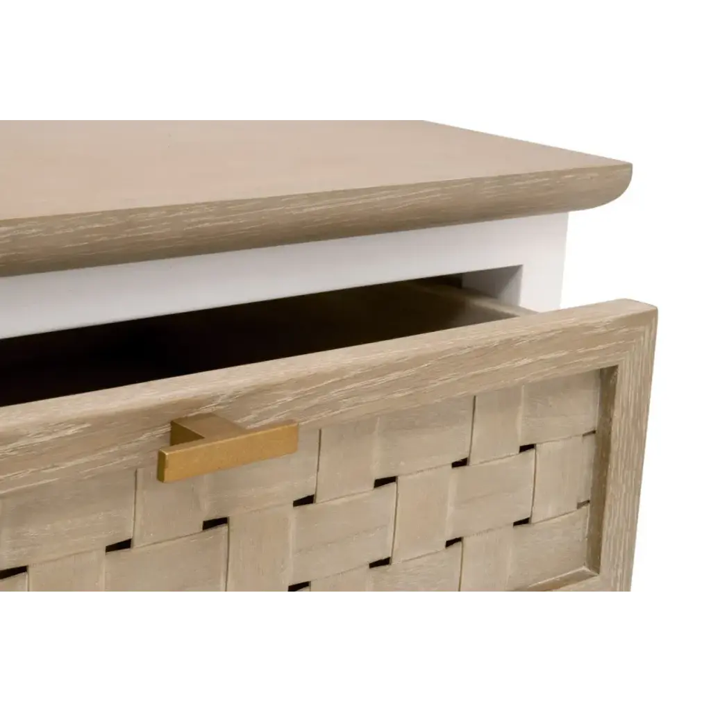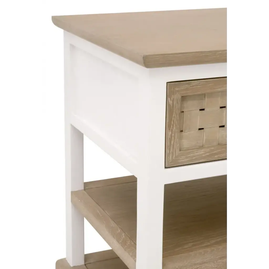 Elevate your living space with the Weave 1-Drawer Side Table by Essentials For Living. This unique bedside table seamlessly blends one-of-a-kind style and functionality. Crafted from solid oak wood and other hardy wood materials, this side table is finished in white and smoke gray wood. It measures a convenient 23.5" wide, 18.5" deep, and 25.25" high. The painted two-tone surround and distinctive wood basket weave drawer design add a touch of artistic flair. The brushed gold drawer handle is simple in design and the dual metal undermount soft-close drawer glides ensure smooth and easy operation. The one drawer and storage shelf are accompanied by a doorless design, making this side table is a practical and stylish addition to any space.