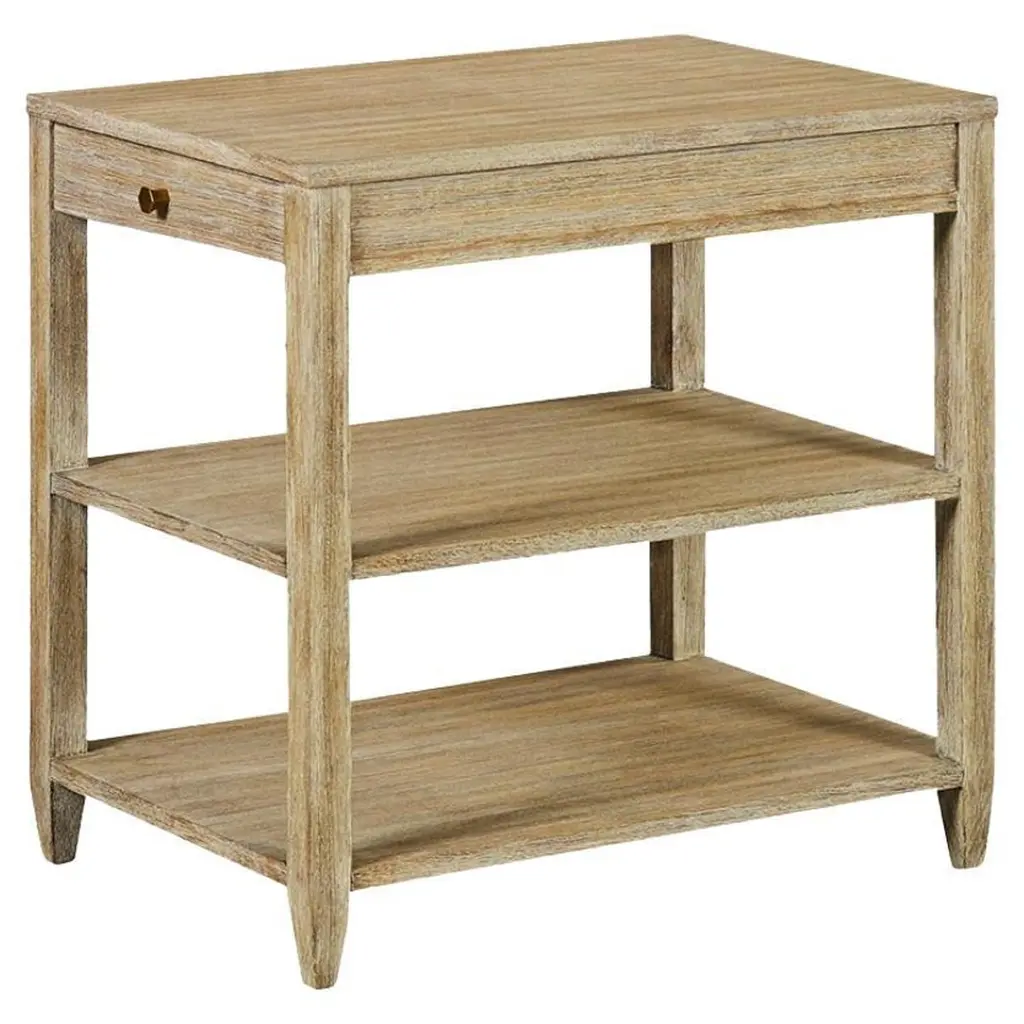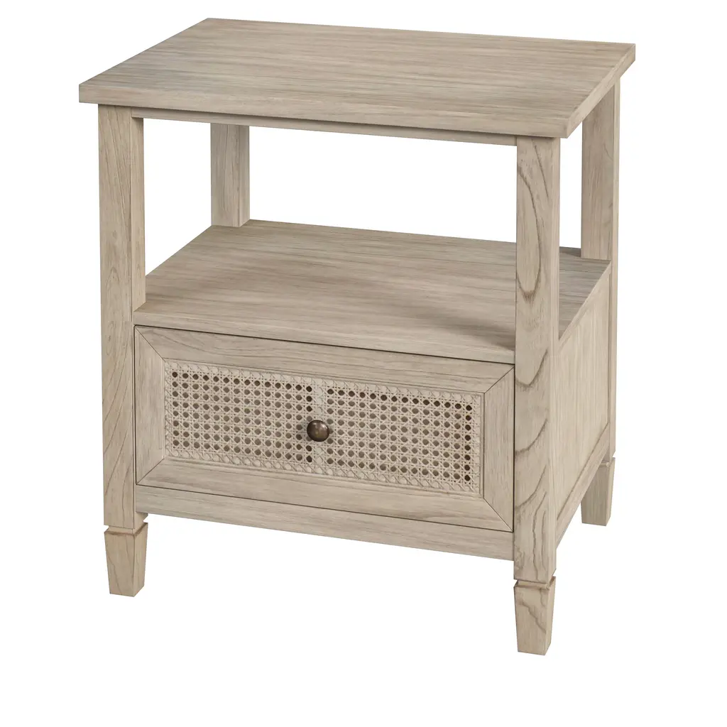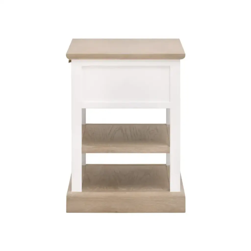 Elevate your living space with the Weave 1-Drawer Side Table by Essentials For Living. This unique bedside table seamlessly blends one-of-a-kind style and functionality. Crafted from solid oak wood and other hardy wood materials, this side table is finished in white and smoke gray wood. It measures a convenient 23.5" wide, 18.5" deep, and 25.25" high. The painted two-tone surround and distinctive wood basket weave drawer design add a touch of artistic flair. The brushed gold drawer handle is simple in design and the dual metal undermount soft-close drawer glides ensure smooth and easy operation. The one drawer and storage shelf are accompanied by a doorless design, making this side table is a practical and stylish addition to any space.