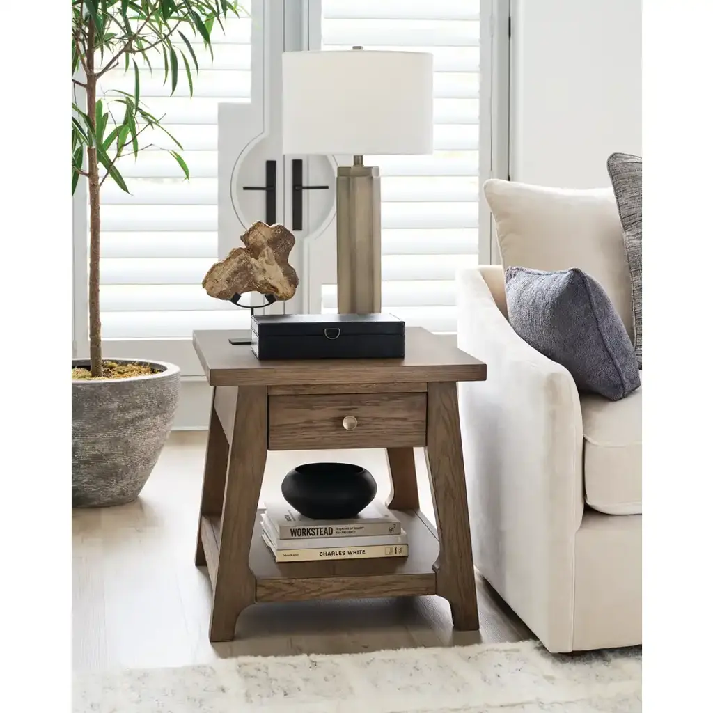 Commanding attention with its generous proportions, the Rectangular Drawer End Table from the Weisman Collection marries traditional elegance with casual comfort. The warm Nutmeg finish celebrates the natural beauty of premium Hickory veneers, while intricate patterned detailing on the top showcases exceptional craftsmanship. Built from select hardwoods, this substantial piece features chunky proportions that ground your living space with timeless appeal. A convenient drawer provides discreet storage, while the lower shelf offers an inviting display space for your cherished items. This masterfully crafted end table strikes the perfect balance between sophisticated design and everyday functionality.