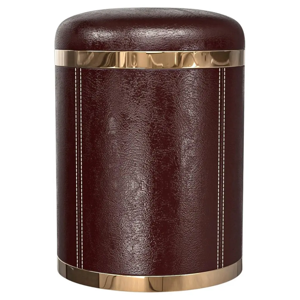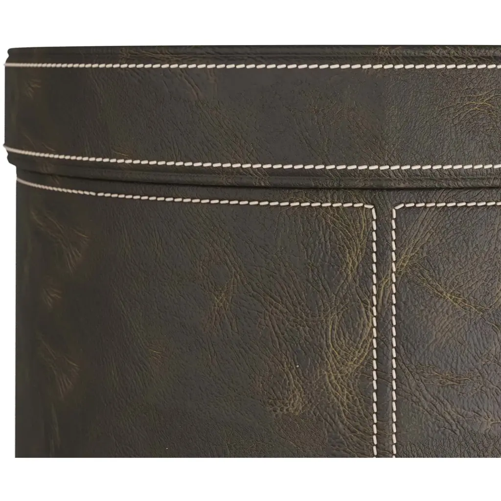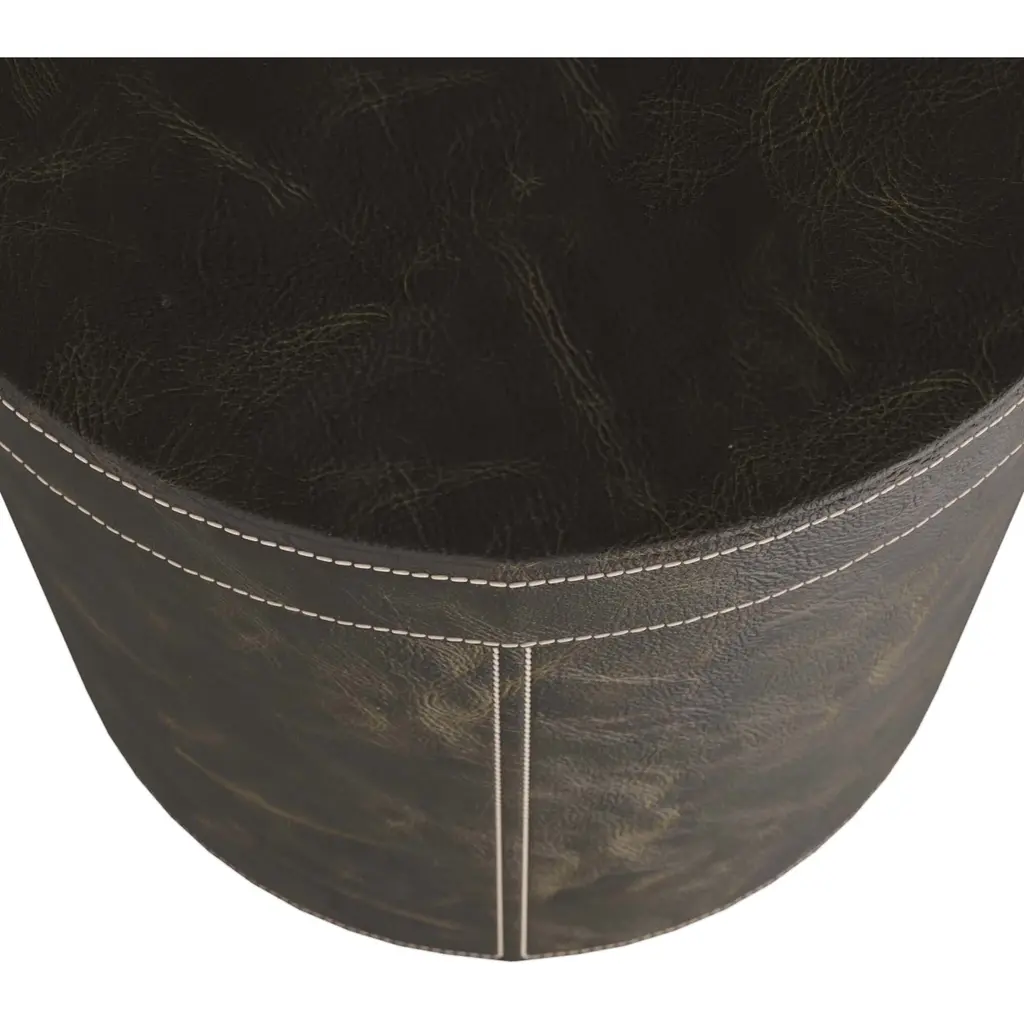 Our wes drum table does double duty, serving as a cache for storing throws and the like. The handsome accent piece is created in moss leather, with contrasting stitching, and fashioned with a lid that lifts to reveal the black suede-lined storage inside. The drum rests on an antique brass plinth. Finish will vary.