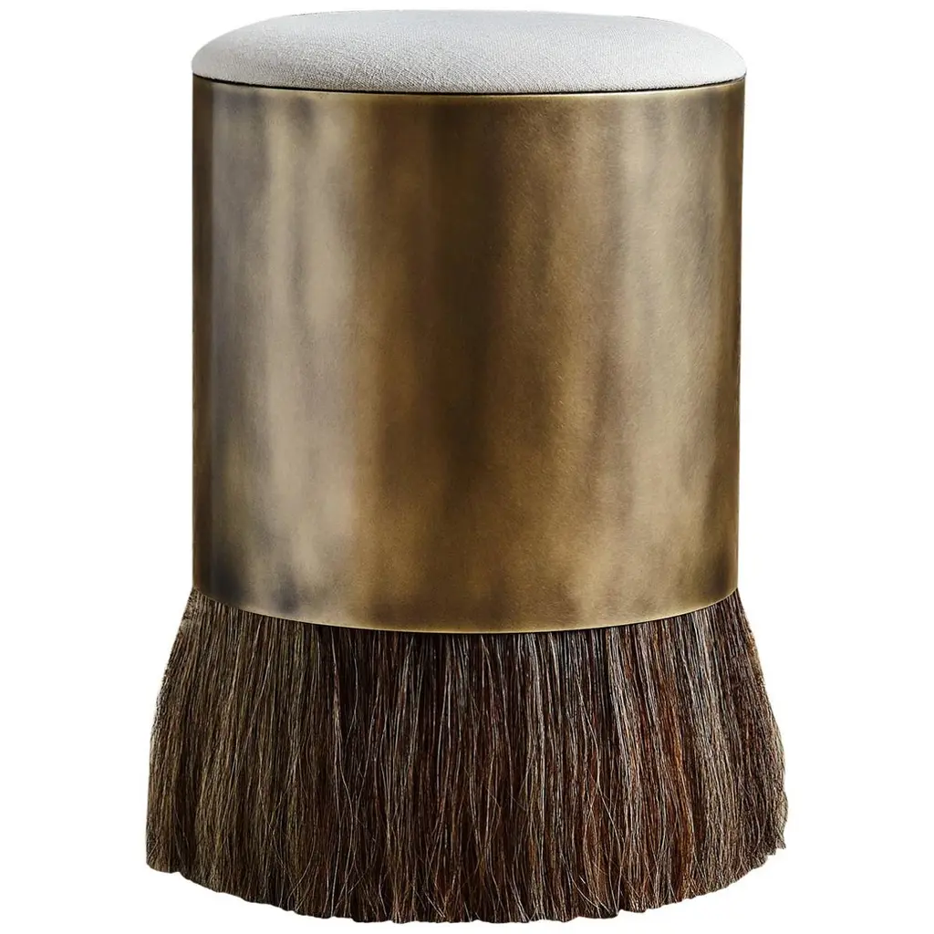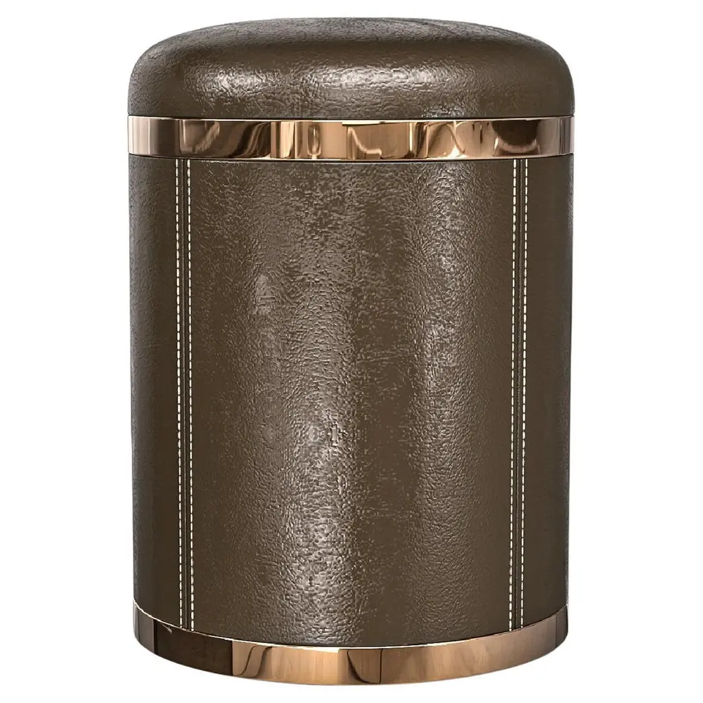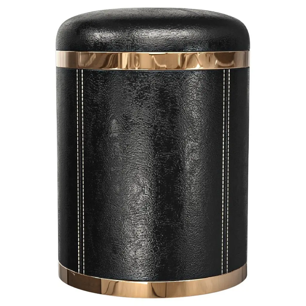 Our wes drum table does double duty, serving as a cache for storing throws and the like. The handsome accent piece is created in moss leather, with contrasting stitching, and fashioned with a lid that lifts to reveal the black suede-lined storage inside. The drum rests on an antique brass plinth. Finish will vary.