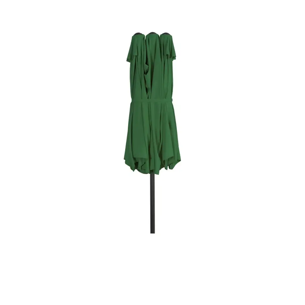 Don't let the exposure to the sun ruin your day, go out and enjoy it with this beautiful double-sided market umbrella that will cover you all day with its large coverage. Constructed with a rust-free steel pole and 12 durable steel ribs that add to the umbrella's strength. The canopy is made of polyester and is protected from the elements with its weather and UV resistance, which blocks out the harmful UV rays. The canopy has a vented design that improves airflow, keeps the umbrella cool, and prevents gusty winds from taking the umbrella.While we strive to accurately represent product colors, please be aware that actual colors may vary slightly due to individual screen settings and lighting conditions. FeaturesCanopy made of strong polyester fabricSimple hand cranked to open and closeVented canopy top to cool down umbrellaStrong aluminum pole with 12 strong steel ribs to support the canopywater and weather resistant polyesterPole powder coated for rust resistance1.9" diameter poleDetails:Product Type: Patio UmbrellasWhat's Included: (1) UmbrellaUmbrellaDimensions: 180" W x 108" D x 94" HWeight: 26.5 lbs.Pole Diameter: 2"