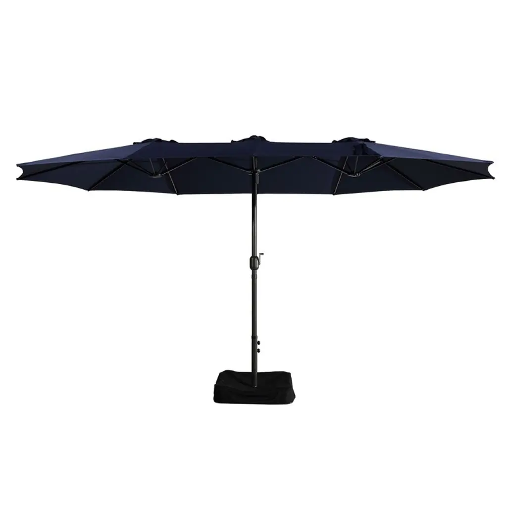 Don't let the exposure to the sun ruin your day, go out and enjoy it with this beautiful double-sided market umbrella that will cover you all day with its large coverage. Constructed with a rust-free steel pole and 12 durable steel ribs that add to the umbrella's strength. The canopy is made of polyester and is protected from the elements with its weather and UV resistance, which blocks out the harmful UV rays. The canopy has a vented design that improves airflow, keeps the umbrella cool, and prevents gusty winds from taking the umbrella.While we strive to accurately represent product colors, please be aware that actual colors may vary slightly due to individual screen settings and lighting conditions. FeaturesCanopy made of strong polyester fabricSimple hand cranked to open and closeVented canopy top to cool down umbrellaStrong aluminum pole with 12 strong steel ribs to support the canopywater and weather resistant polyesterPole powder coated for rust resistance1.9" diameter poleDetails:Product Type: Patio UmbrellasWhat's Included: (1) UmbrellaUmbrellaDimensions: 180" W x 108" D x 94" HWeight: 26.5 lbs.Pole Diameter: 2"