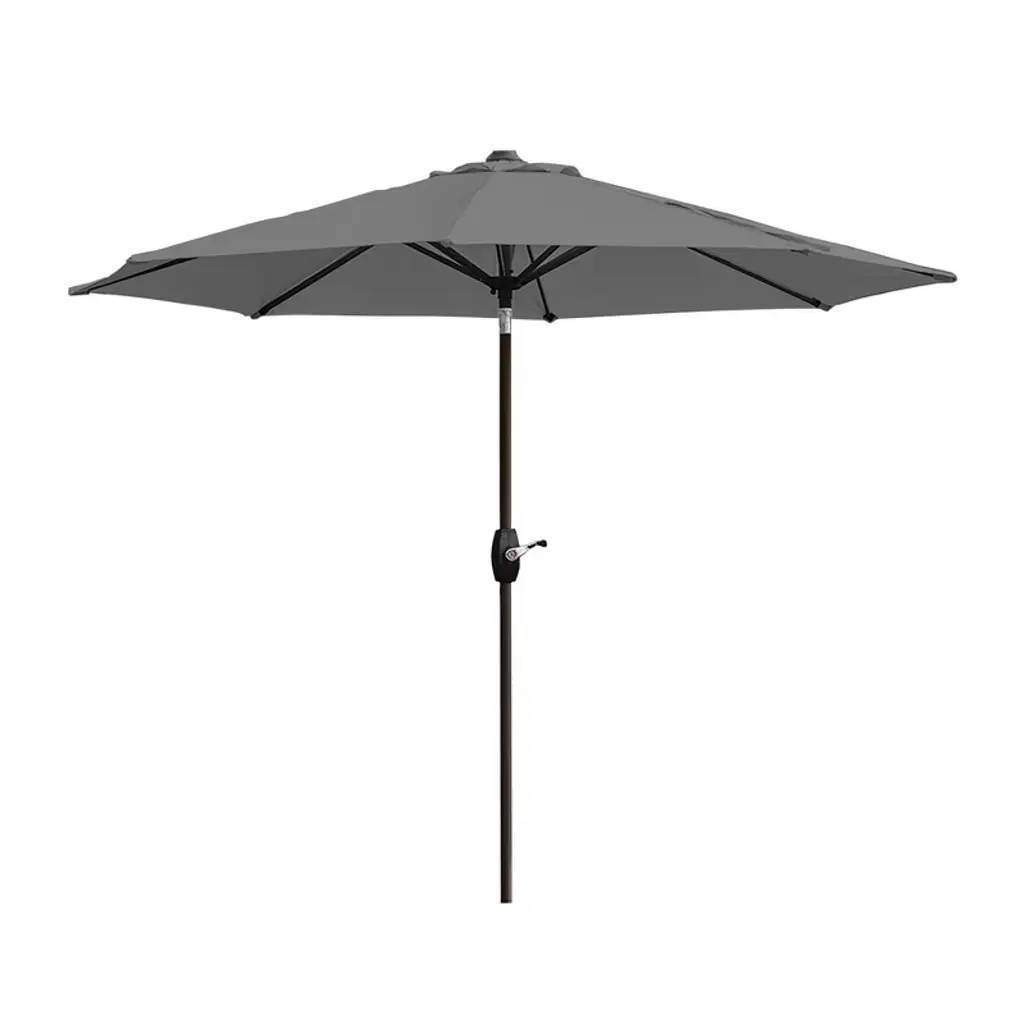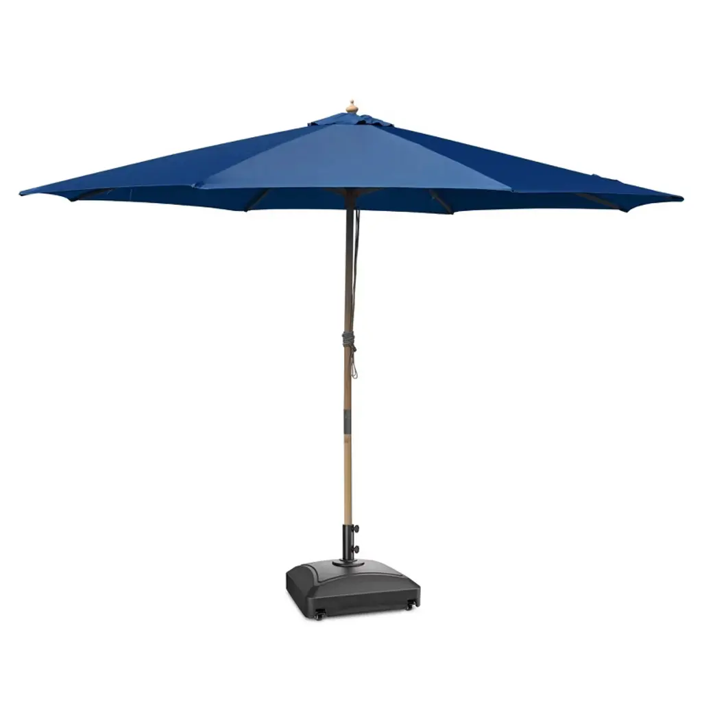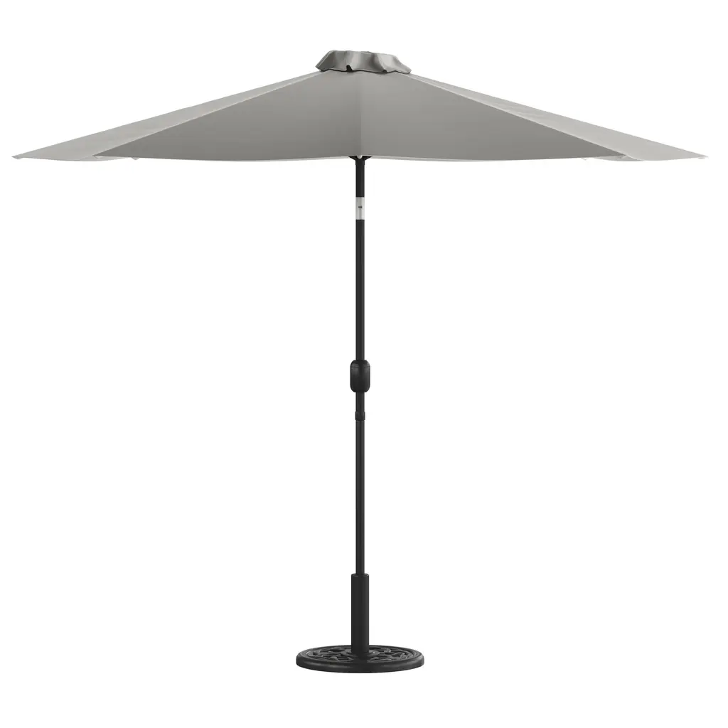 Stay in the shade this summer with this beautiful 9 ft. umbrella. Made of a solid-colored polyester canopy that shields you from harmful UV rays and has a weather and water-resistant treatment to keep the canopy looking great each season. To keep you safe from the sun, the weather-resistant pole has a simple crank lift and a manual push-button tilt to open the umbrella with ease and adjust the canopy to block the sun. There is no need to search for the ideal base because a base includes a lovely HDPE fillable base with a convenient handle.While we strive to accurately represent product colors, please be aware that actual colors may vary slightly due to individual screen settings and lighting conditions. FeaturesSet includes: one (1) 9 ft market umbrella one (1) fillable baseWeather and water resistant polyester canopySimple crank lift and push button tiltDurable aluminum pole and steel frameHDPE fillable 50 lb baseDetails:Product Type: Patio Umbrella & BaseWhat's Included: (1) Umbrella; (1) Umbrella BaseUmbrella BaseDimensions: 18" W x 18" D x 10.5" HWeight: 3.25 lbs.Weight: 12 lbs.Pole Diameter: 1.5"UmbrellaOverall Height: 92.25"Canopy Width: 108".