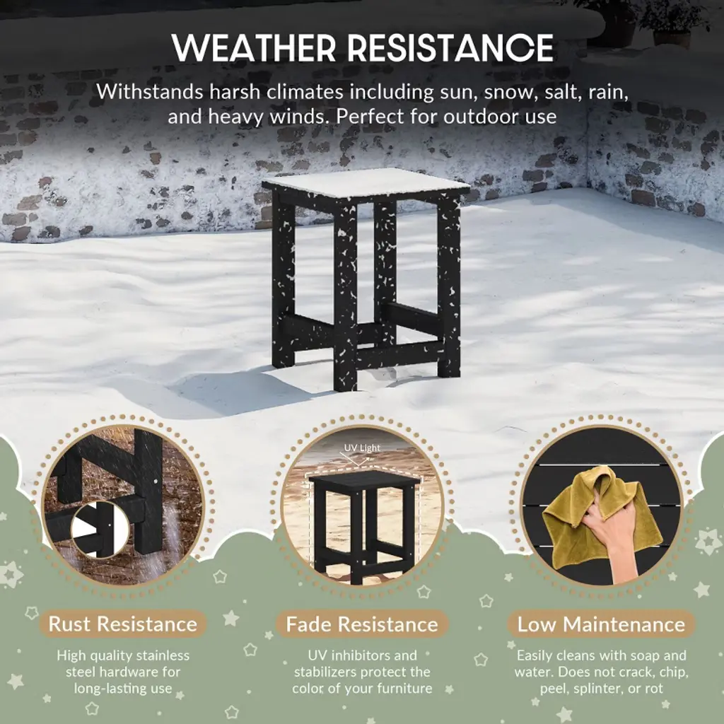 Make playtime a bit more fun with our kid's square Side Table, which also can be used as a kid's play table. Made from a durable and kid friendly HDPE material that is perfect for your little one thanks to the durability that can withstand playtime. Indoor or outdoor this table is ideal thanks to the UV and Fade resistance that is sure to keep that charming color season-long. Created with safety in mind with the thick legs that are supported by the beam connections across each leg for a more stable design and a reinforced table top that ensures a stable design overall.While we strive to accurately represent product colors, please be aware that actual colors may vary slightly due to individual screen settings and lighting conditions. FeaturesConstructed from Durable HDPE Material that is Safe for your Little Ones and Designed to be Stable and SturdyWeather Resistant to Protect Against the Harsh Outdoor ElementsFade and UV Resistant to Protect Against the Sun12" Inch Wide Table Top that is Perfect for Your Little One to Play OnDesigned for Safety with the Thick Legs that are Connected by Beams for a Stable Design and durable enough that will not splinter, crack, chip, or peelSimple clean with lukewarm water, mild soap, and soft bristle brushRust Resistant Stainless Steel HardwareDetails:Product Type: Patio Side TablesWhat's Included: (1) Side TableTable Top Width: 12"Table Top Depth: 12"Table Top Thickness: 0.75"Side TableDimensions: 12" W x 12" D x 15.75" HWeight: 8 lbs.Table Top Width: 12"Table Top Depth: 12"Table Top Thickness: 0.75"
