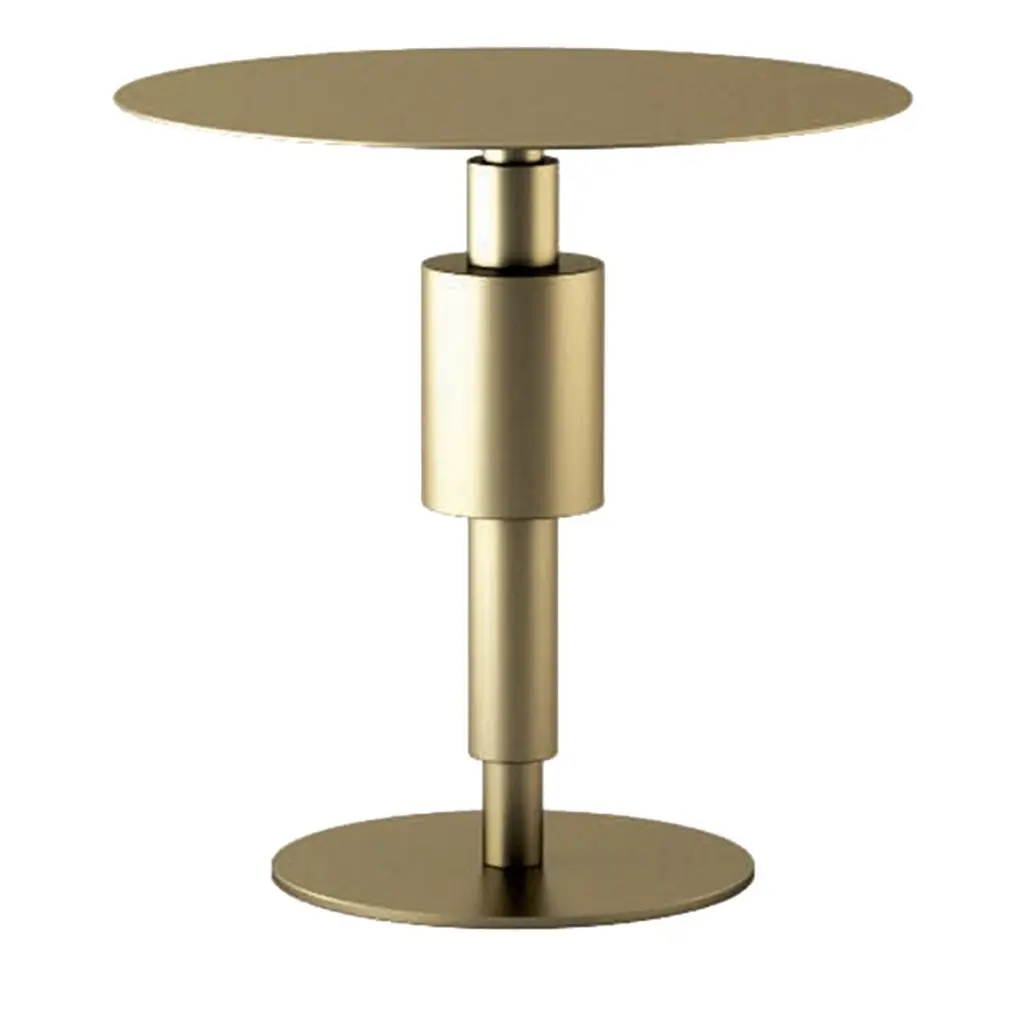 Alone or in a group, this striking side table will make the most lustrous statement in a contemporary living room, particularly with monochromatic furnishing. The small circular base and the unique concentric tubular pedestal form the structure in brass section, while the round top is entirely in brass. The entire piece has a polished burnished brass finish that will add a warm accent to brighten up any room it is placed in.