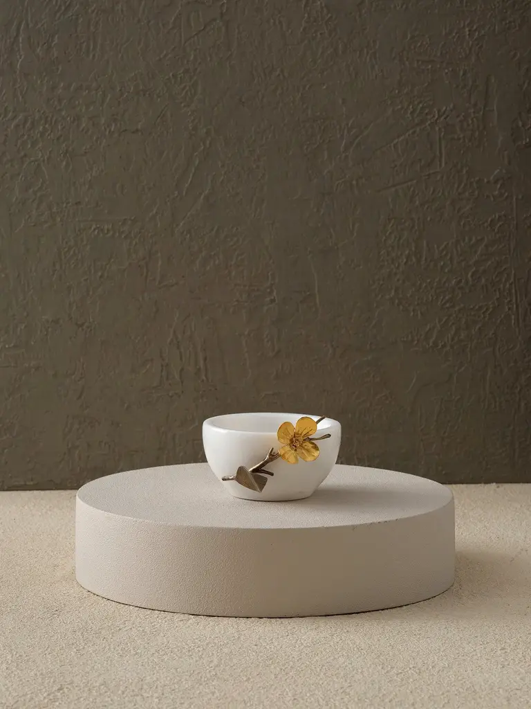 Delicate, graceful, and naturally refined — the White Marble Bowl With Gold Flower Detail brings a poetic charm to any setting. Hand-carved from solid white marble, this bowl is adorned with a sculptural floral accent in gold and bronze tones, offering a graceful contrast between natural stone and metal artistry.Whether used to serve sweets, hold trinkets, or simply as a decorative object, it adds a soft botanical touch to your space. Ideal for gifting or as a luxurious accent on a vanity, coffee table, or console.