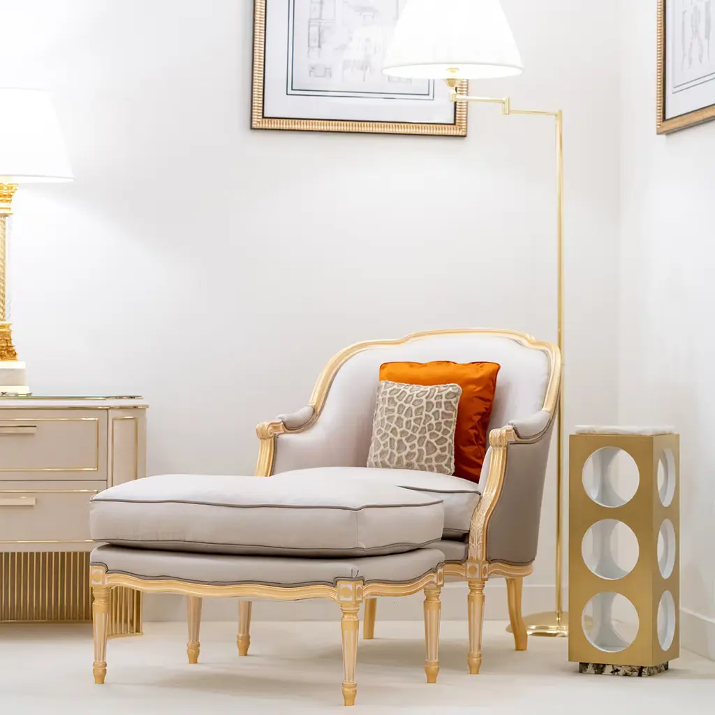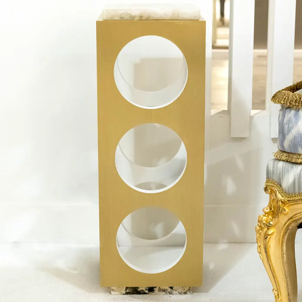 A testament to subtle refinement, this superb side table is a guaranteed conversation starter. The sleek, rectangular silhouette is fashioned of brass-plated wood with a matte finish accentuated by horizontal circular cut-outs recalling a three-signal stoplight. The base and top are in Patagonia marble, its deep white hues and earth-hued accents completing the refined aesthetic.