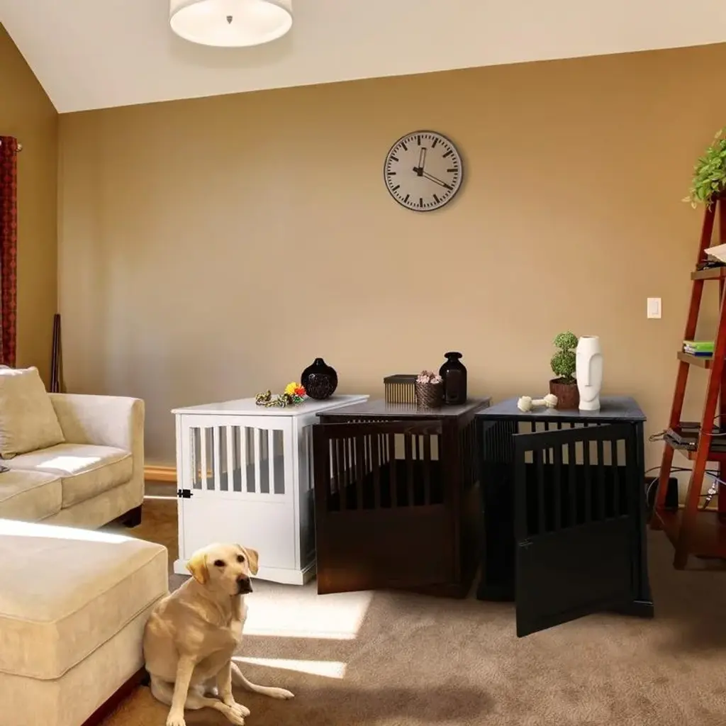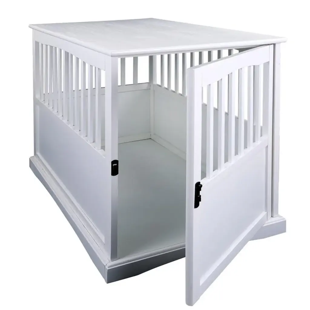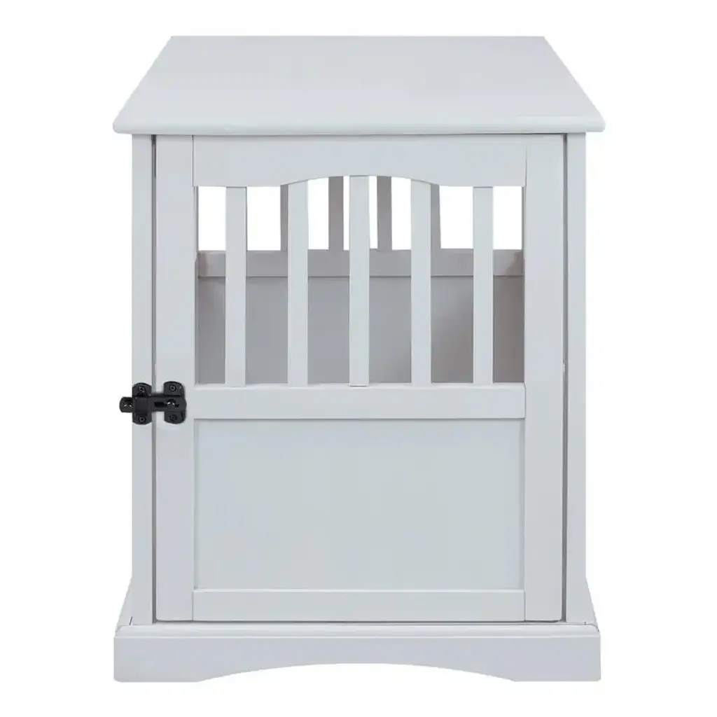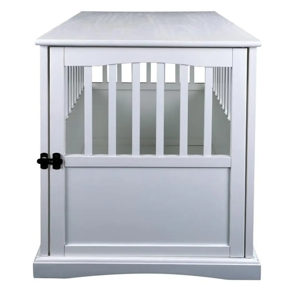 Add style and functionality to your home with this beautiful White Wood Pet Crate End Table. This dual-purpose piece of furniture is perfect for pet owners who want to keep their furry friends safe and happy while maintaining the elegance of their living space. Made of solid wood with a painted white finish, this end table pet crate is durable and features a lockable door to keep your pet secure. The slatted design ensures airflow and provides your pet with plenty of visibility, while the top storage space allows you to keep your belongings close at hand.Features:Dimensions: