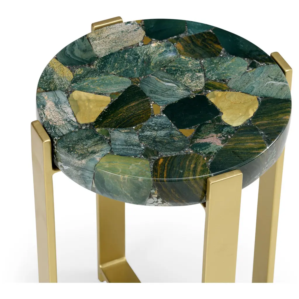 JASPER ACCENT TABLE (LG). NATURAL MULTI GREEN STONE TOP WITH ANTIQUE GOLD FINISH ON IRON BASE
