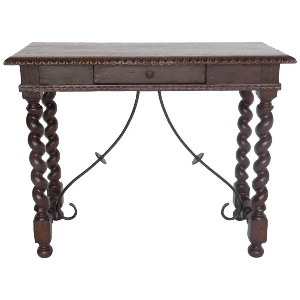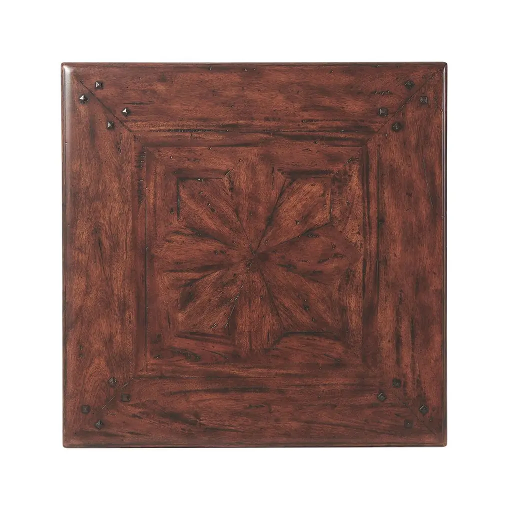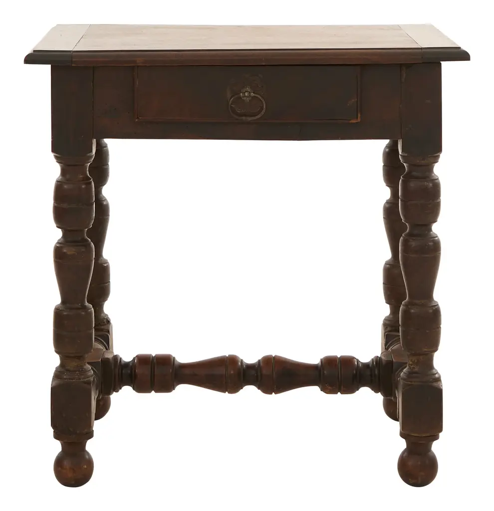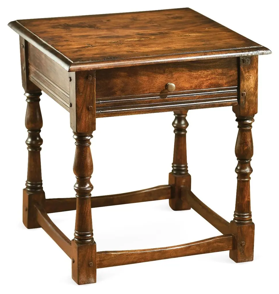 A William and Mary style antiqued wood end table, the square parquetry top above a drawer, and bell turned legs joined by a serpentine 'x' stretcher. Dimensions: 26" X 26" D x 26.5" H.