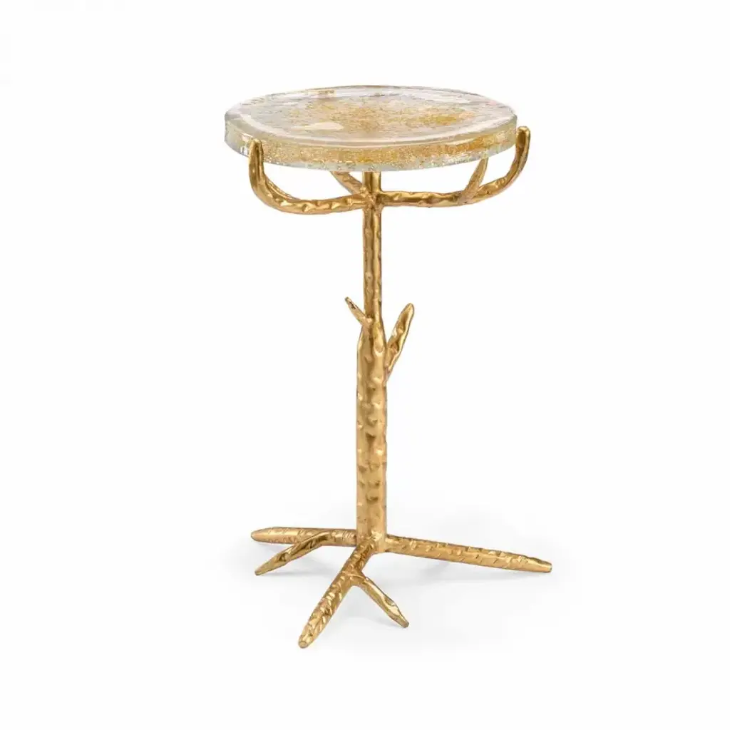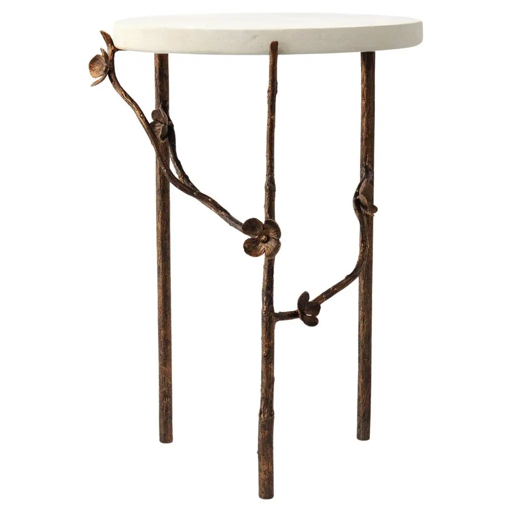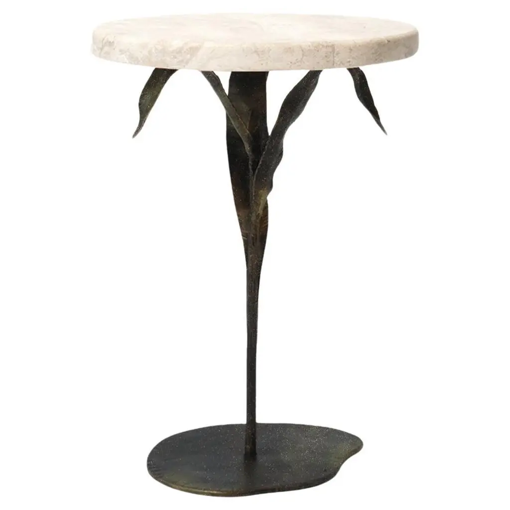 Infuse your elegant interior with the enchanting presence of the Willow Accent Table, meticulously crafted by skilled artisans. This versatile piece can be placed next to an armchair or sofa, in a foyer, or anywhere that calls for an artisan-made accent, effortlessly adding a touch of visual appeal to your space.The captivating matte travertine top provides a neutral and refined finish, perfectly complementing the hand-forged, textured, and painted base. The base itself is a work of art, with three delicate leaves gracefully bending towards one another before folding in unity to elegantly capture the tabletop.Every curve and detail of the Willow Accent Table showcases the artistry and dedication of the artisans who bring it to life. Its presence not only enhances the aesthetic of your space but also becomes a conversation piece, stirring admiration and appreciation for the beauty of handcrafted furniture.Elevate your interior with the Willow Accent Table and revel in the artisan-made craftsmanship that embraces both functionality and refined beauty.As you admire this mesmerizing piece, its impeccable craftsmanship becomes evident. Each handcrafted detail showcases the skill and passion of the artisans who created it, resulting in a timeless piece of functional art.Elevate your living space with the Modern Cherry Blossom Accent Table and immerse yourself in its beauty, where artistry and nature converge in perfect harmony.