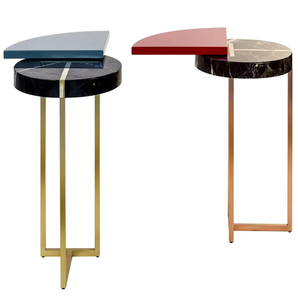 Part of the Intersections collection, the red Wing End Table is a contemporary piece creates a harmonious aesthetic. The brass base and Marquinia marble perfectly complement the vertical pivot that allows the rotation of the lacquered wood.