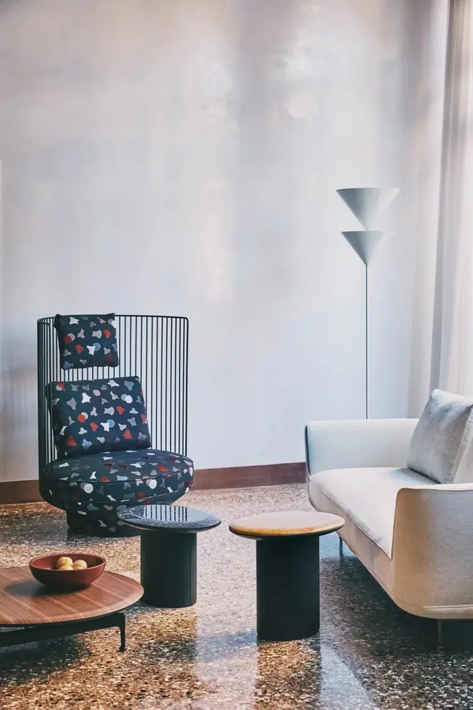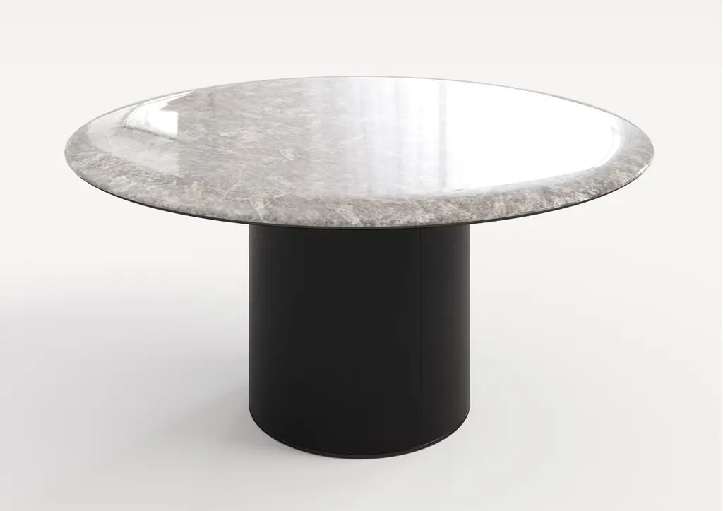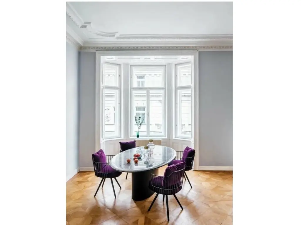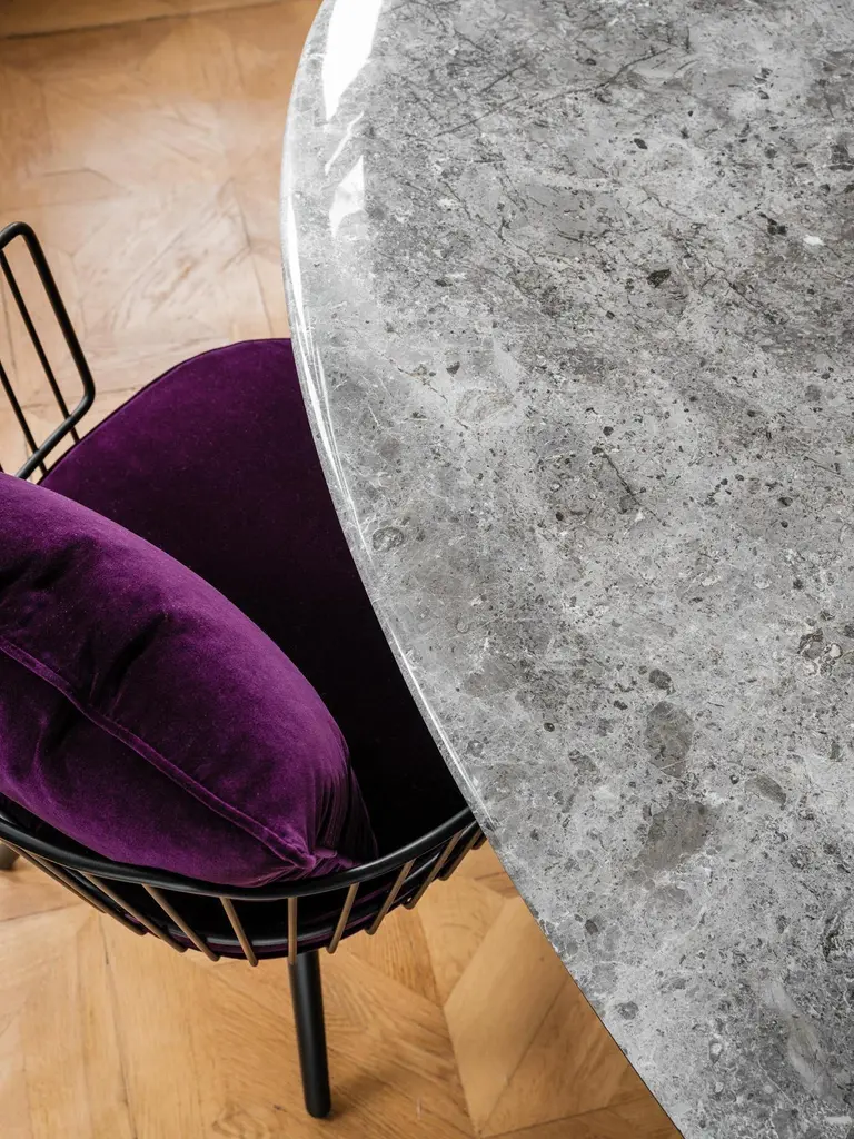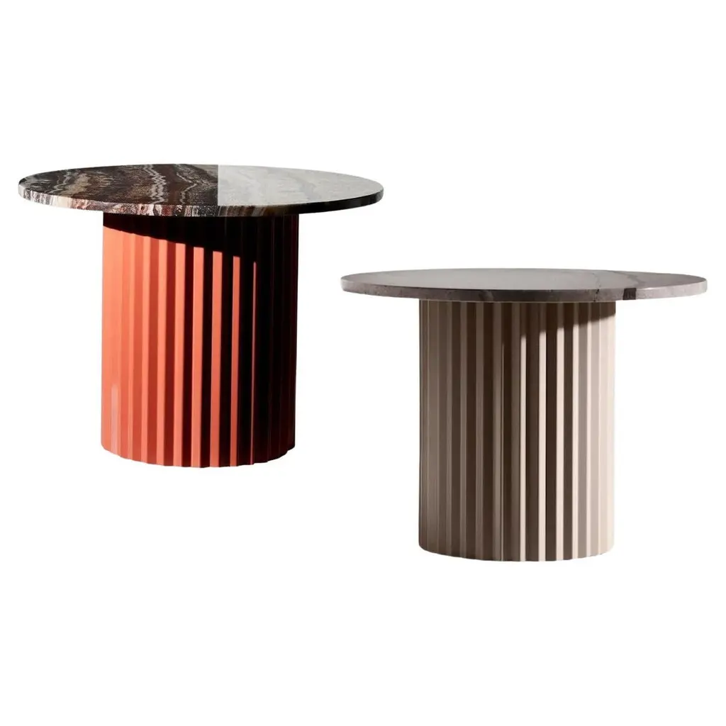 At the time of the Wiener Werkstätte around the 1900s, Josef Hoffmann designed extravagant brooches made in traditional craftsmanship. These colorful time- lessly beautiful jewelry inspired Luca Nichetto to create this extraordinary table collection. The elliptical plates in rare colored marble varieties can be arranged into each other, they thus playfully create very special table- scapes. In addition to the side table group, a variant in dining table height is also available.The colorful brooches of Josef Hoffmann inspired Luca Nichetto to this extraordinary table collection. The elliptical plates can be arranged into variable tablescapes. In addition to the side table group, a variant in dining table height is also available.Base: leather covered color black glides: felted glides.