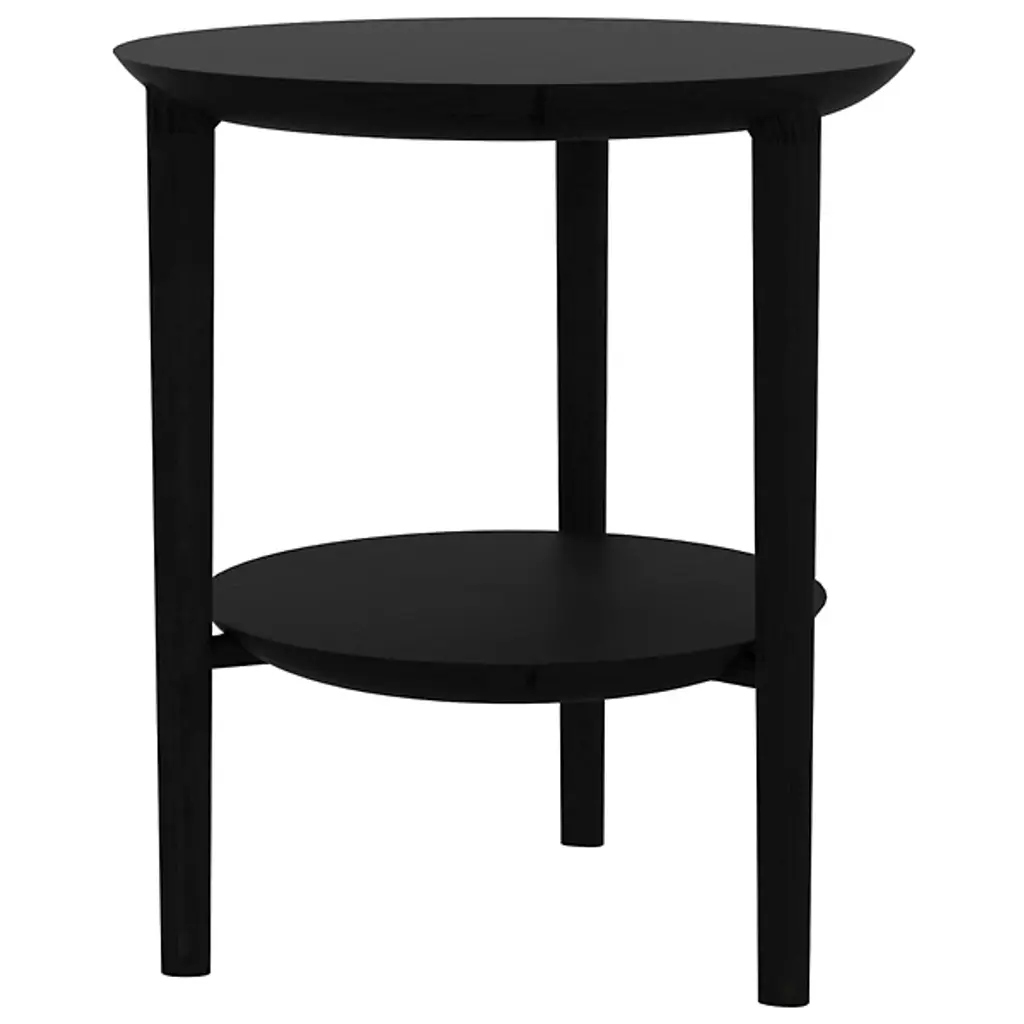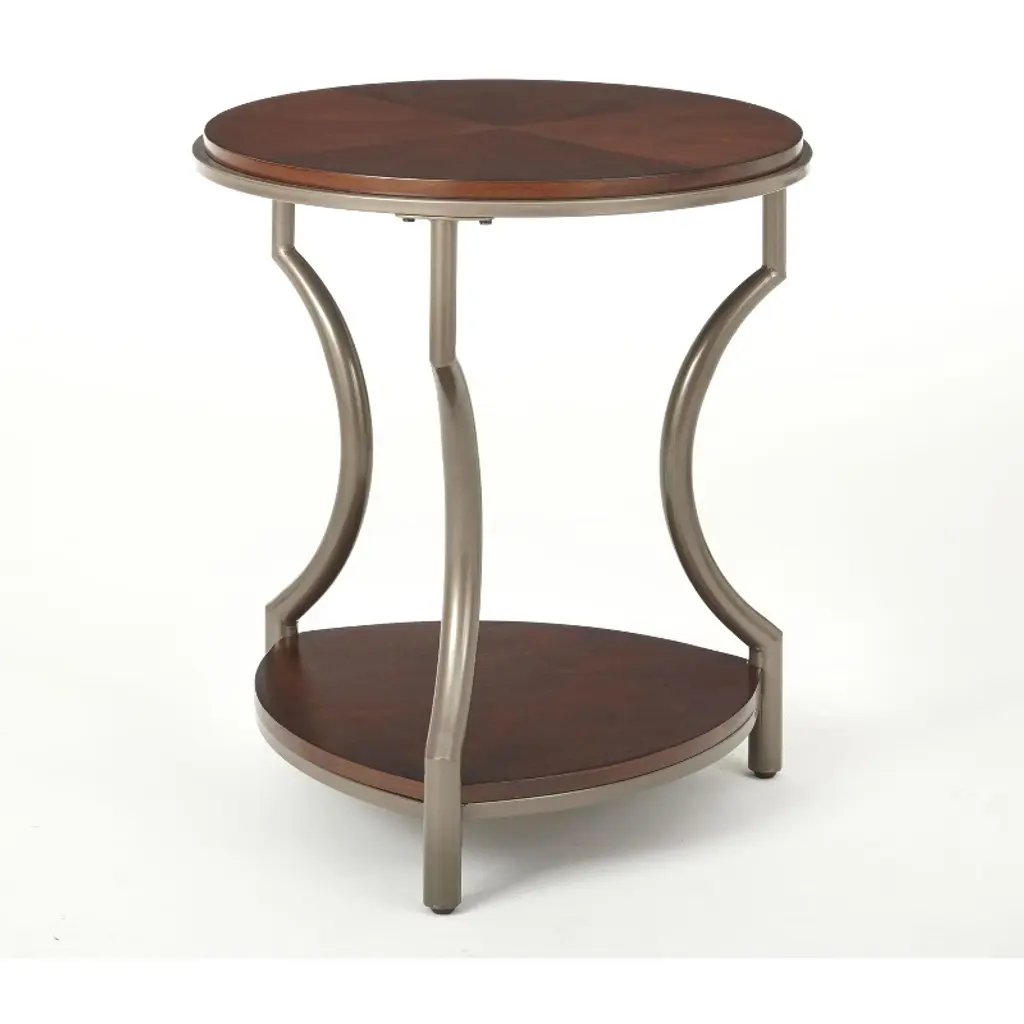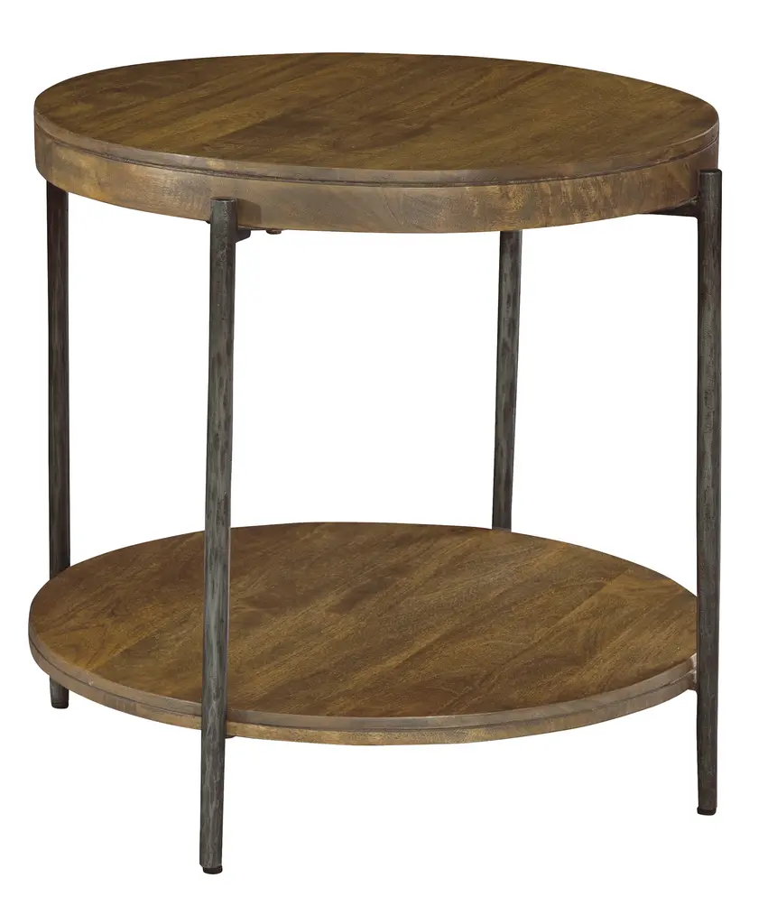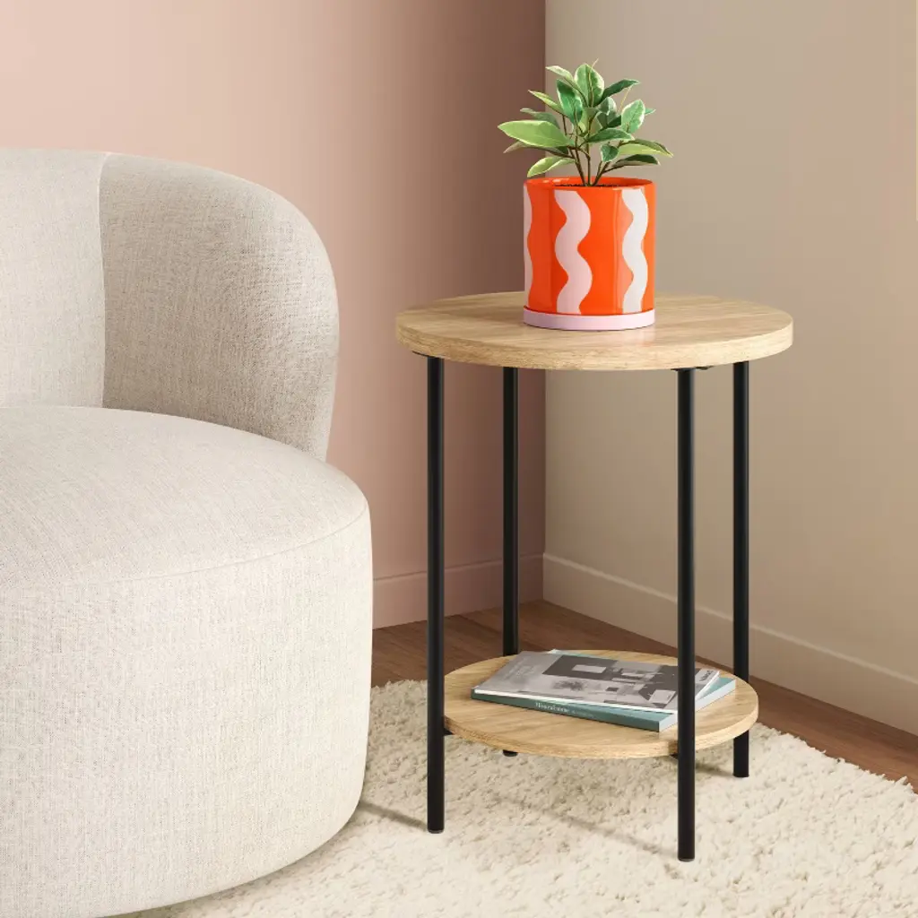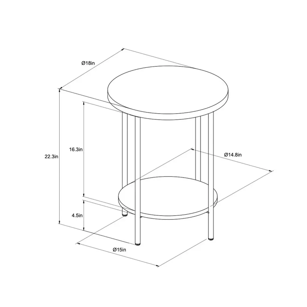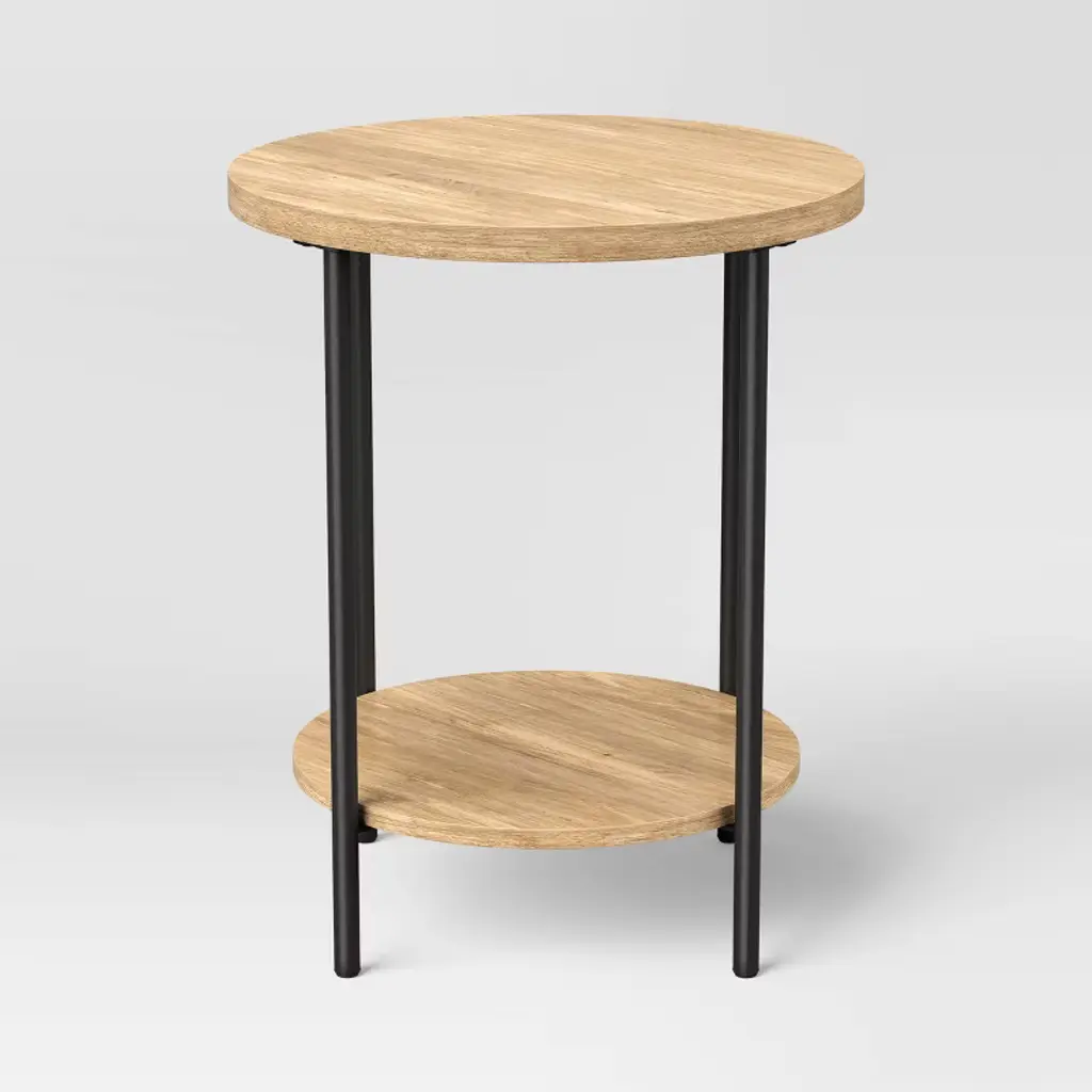 Bring a blend of modern and industrial style into your home with this Wood and Metal Round End Table from Room Essentials™. This practical end table makes a perfect addition to any living room decor. It features a rounded shape with a sleek and airy structure for a chic modern look. The wooden tabletop and a lower shelf provide plenty of room for storage and display, while the solid metal frame brings an industrial element of style. Place it next to your sofa in your living room or alongside your favorite comfy chair to rest your book, cup of tea, small potted plant or a lamp. Detailed Dimensions:Overall Width and Depth: 18 inchesOverall Height: 22.3 inchesDistance between opposite legs: 15 inchesDistance from floor to bottom shelf: 4.5 inchesDistance between top shelf and bottom shelf: 16.3 inchesWidth and Depth of bottom shelf: 14.8 inches