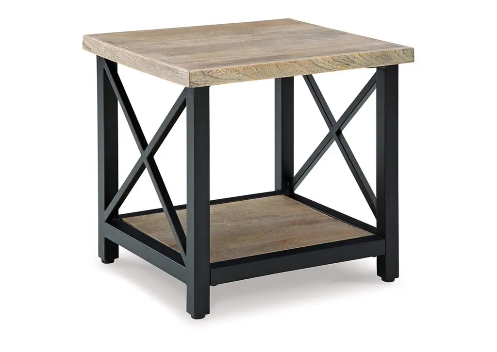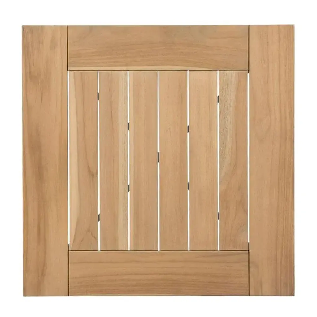 A handsome side table designed for outdoor purposes has a square slatted teak wood top elevated on a metal base with squared legs accented by a graceful support arch.