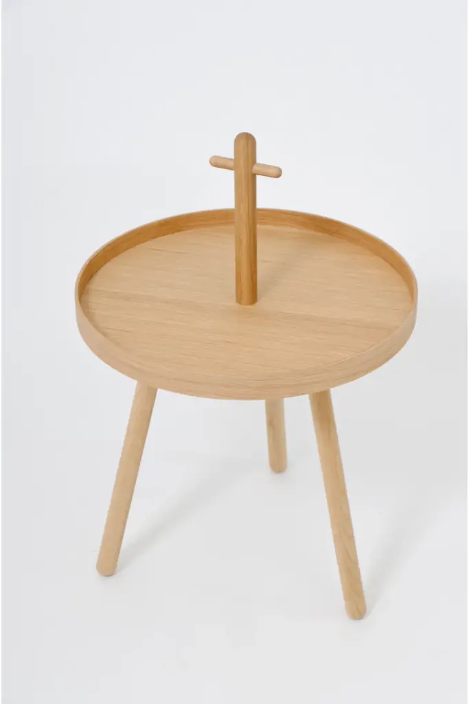 Pick Me Up table combines contemporary style with practicality. The feature handle makes it easy to move from one place to another. It’s a handy side table to use when the occasion arises - a place for snacks and drinks while entertaining friends and when they leave, move it out of the way. It’s also a convenient place for keeping phones, wallets and keys. The slim lip edge stops spills and prevents things from sliding off. Three legs provide great stability. Finished with a matt lacquer to protect against stains, it’s both hardwearing and stylish. Pick Me Up is made from sustainably harvested natural American white oak and oak veneers, selected for their warm color, beautiful grain pattern and traditional hardwood durability. All edges look crisp but are carefully hand sanded to make them soft to the touch. Finished with a matt, water-resistant lacquer. Design by Lincoln Rivers.