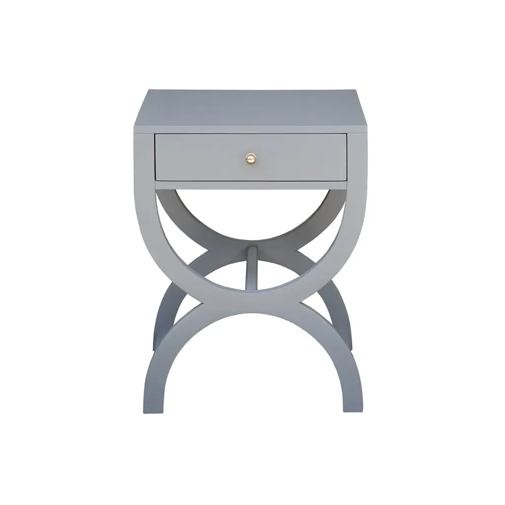 The graceful geometric legs on the one drawer Alexis side table by Worlds Away complement a broad range of interior design styles. With a matte white lacquer finish and a delicate brass hardware pull, Alexis offers both storage and style. Also available in grey.