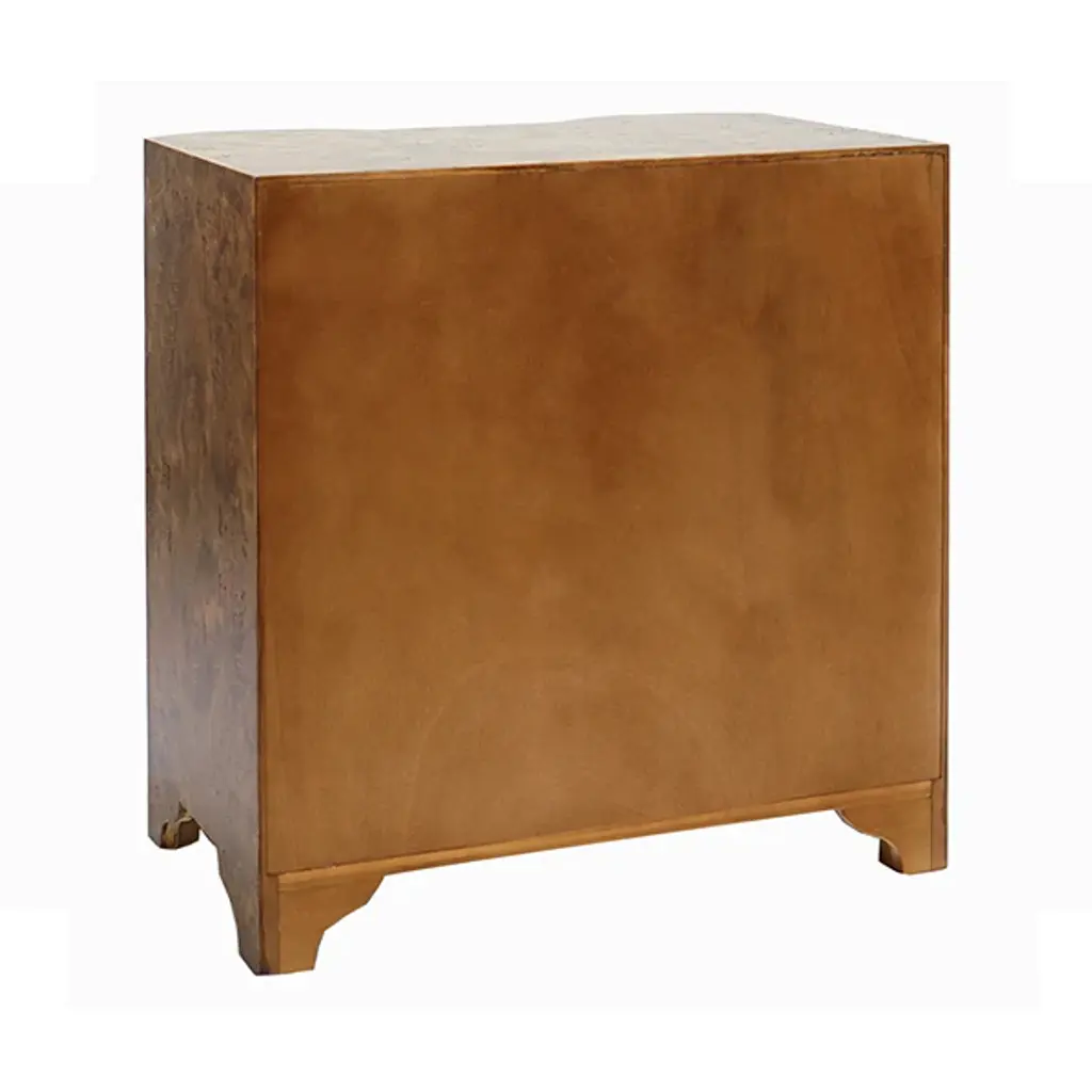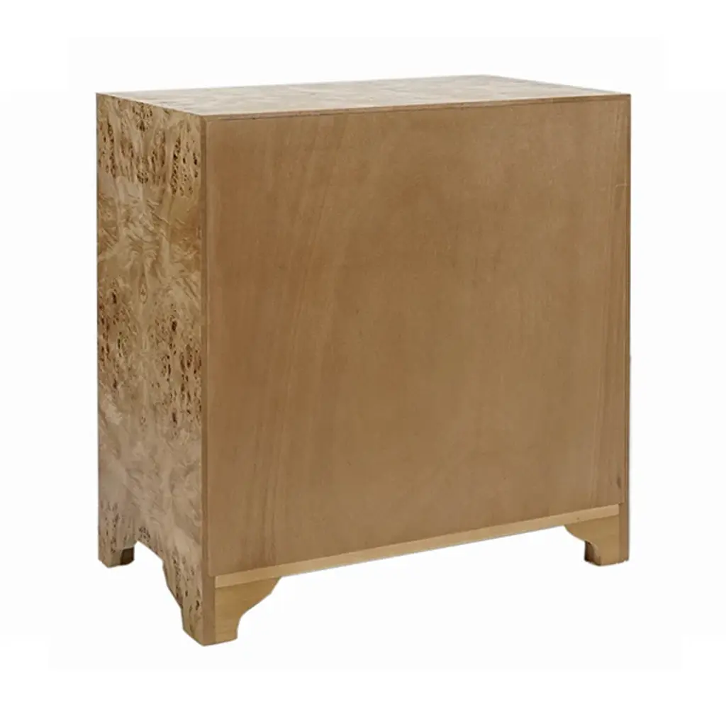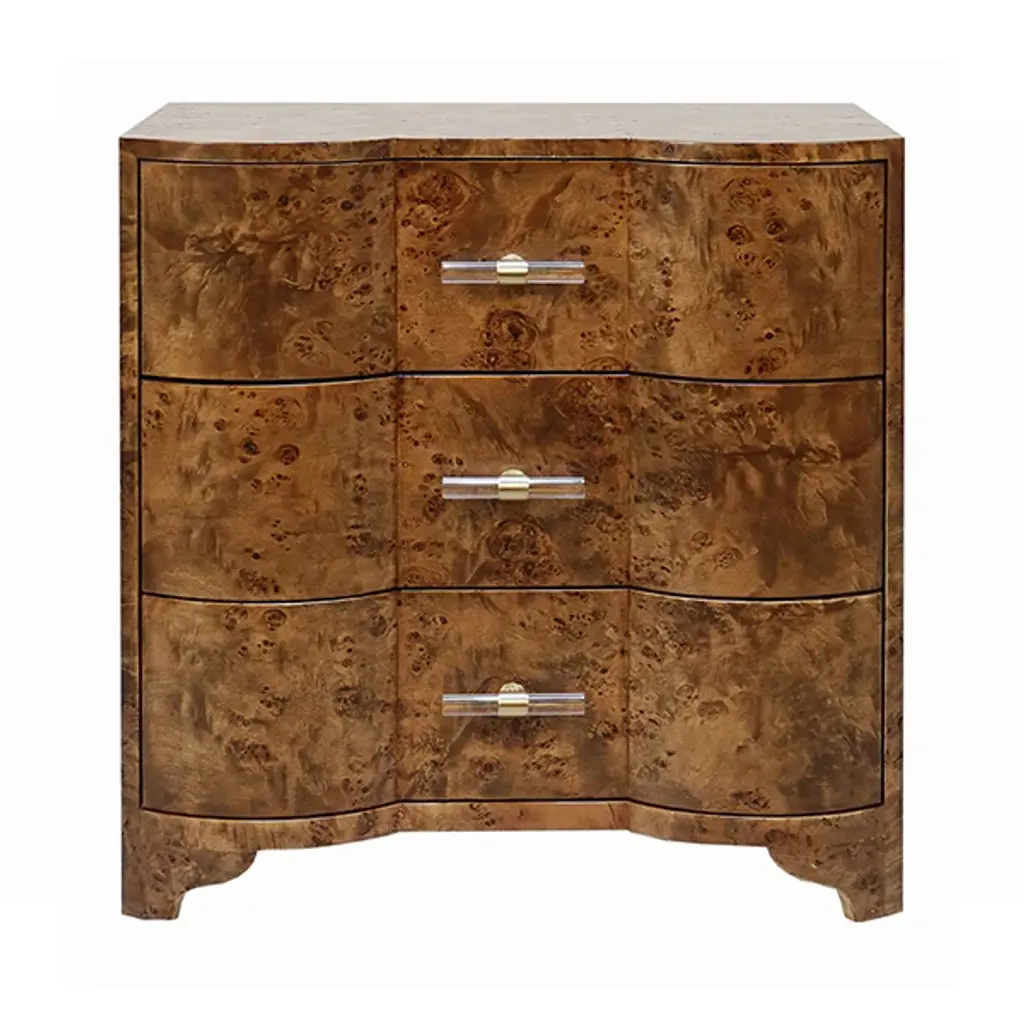 The stunning Calvin three drawer side table by Worlds Away is a modern heirloom in the making! Distinctive, serpentine profile is dressed in exquisite, matte burl finish and accented with acrylic cylinder & brass hardware. Three generously scaled drawers make Calvin an elegant storage solution for any interior.