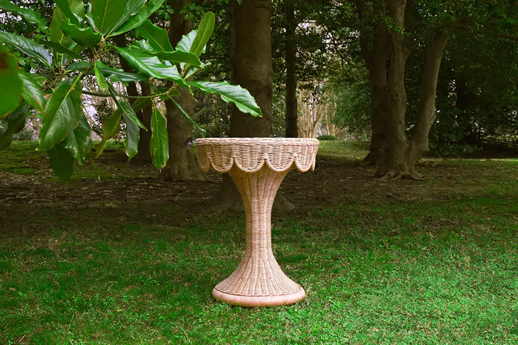 The Worlds Away Orla side table features a round top with a feminine scalloped edge atop a pedestal base. Finished in light rattan, this gorgeous side table works equally well in the bedroom, living room, or next to your favorite chair!