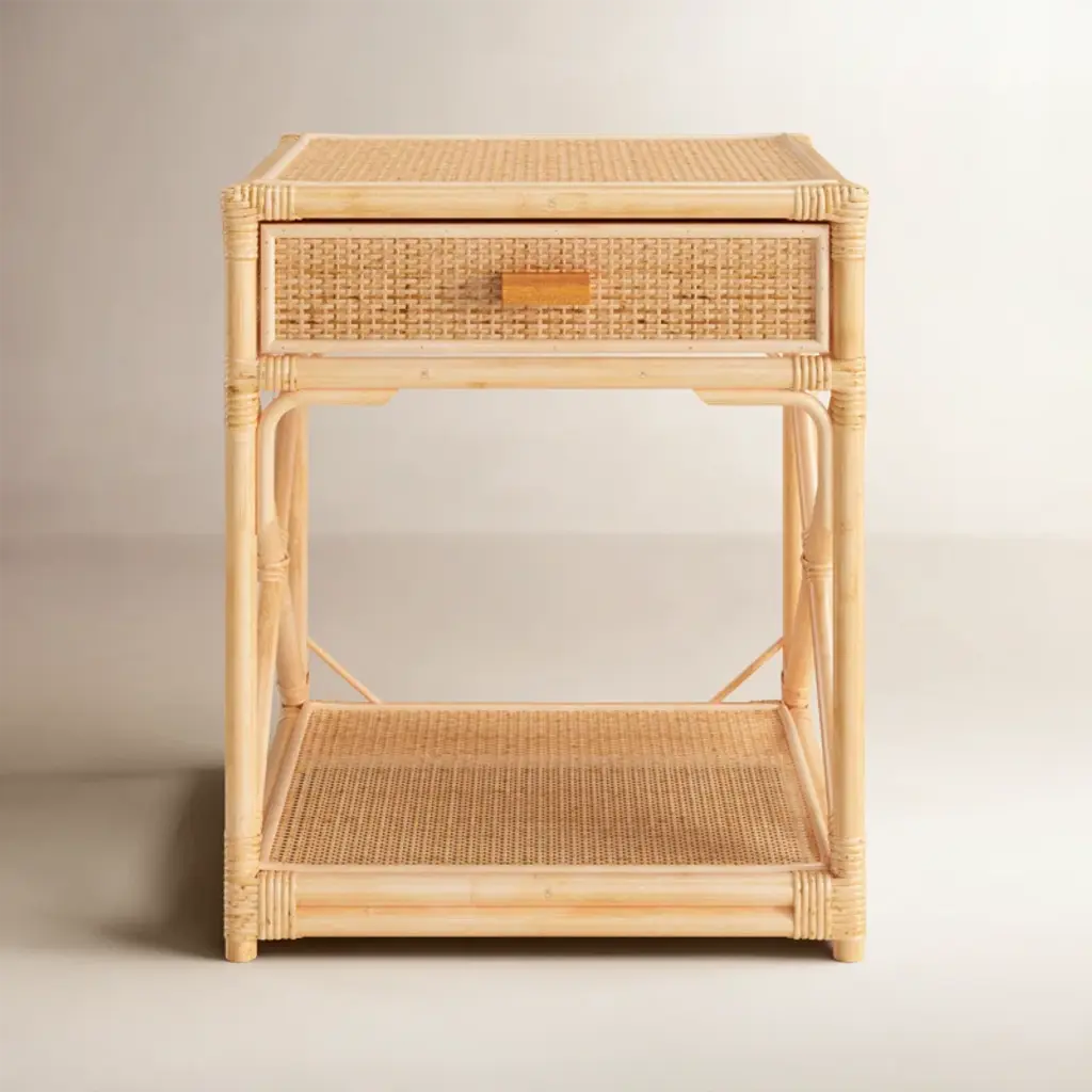 Its classic shape and rattan finish ensure the Reed side table by Worlds Away will remain a modern classic for years to come. Thoughtfully designed with a brushed brass pull, a soft close drawer, and a natural rattan finish- this table functions equally well next to a sofa, a chair, or a bed. An elegant and timeless showpiece!